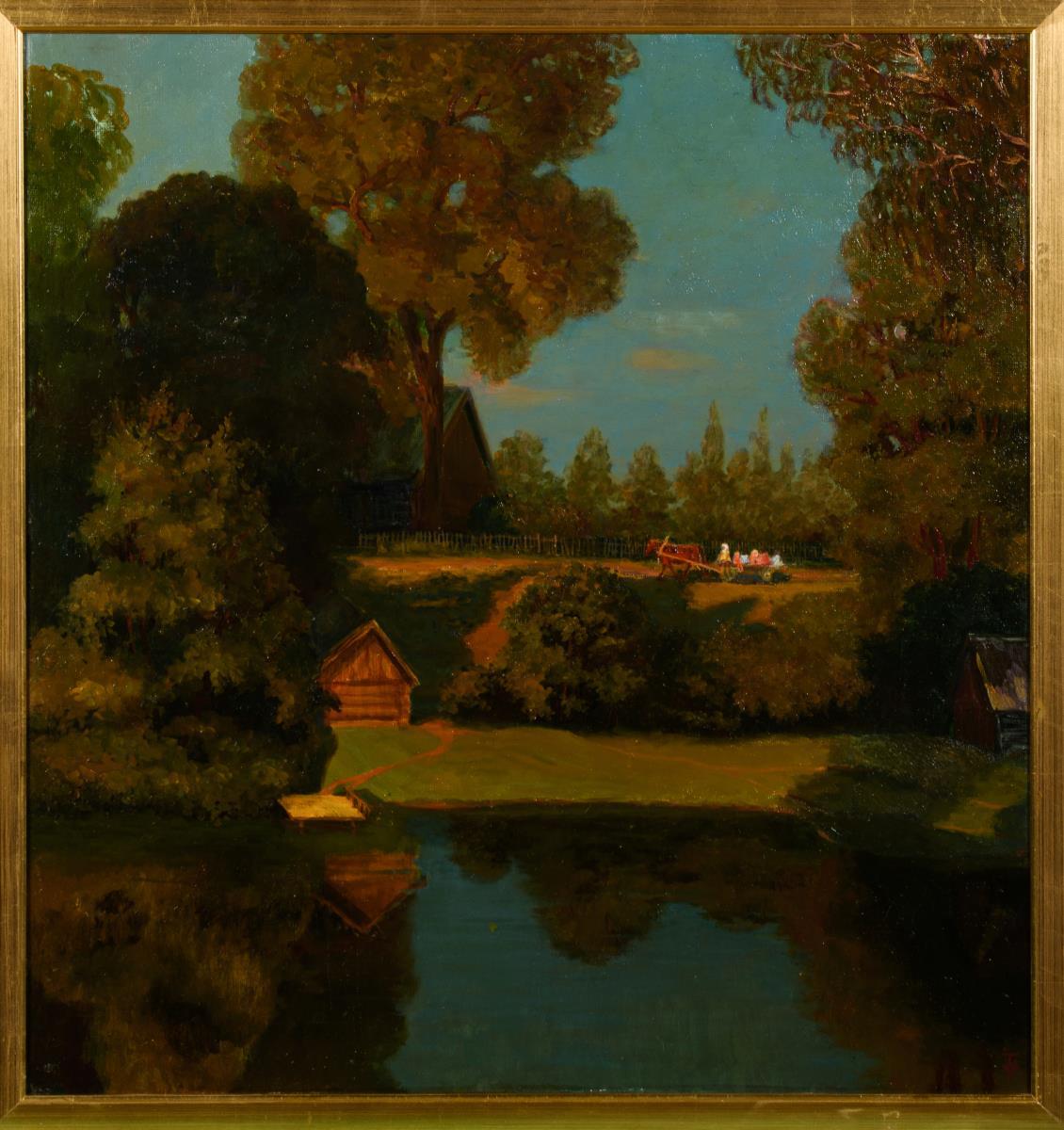 FEDOROVA, Tatyana (*1954 Woronesh) Abend am See Öl/Leinwand. Russland. Rechts unten monogrammiert, verso kyrillisch bezeichnet/betitelt. Datiert: 1987. 80 x 75 cm. Gerahmt: 84 x 80 cm. Fuhrwerk mit Mutter und Kindern im Sonnenschein entlang des Sees. Russische Malerin, besuchte die Kunstschule Buturlinouka sowie die pädagogische Hochschule der Stadt Tscheboksary..