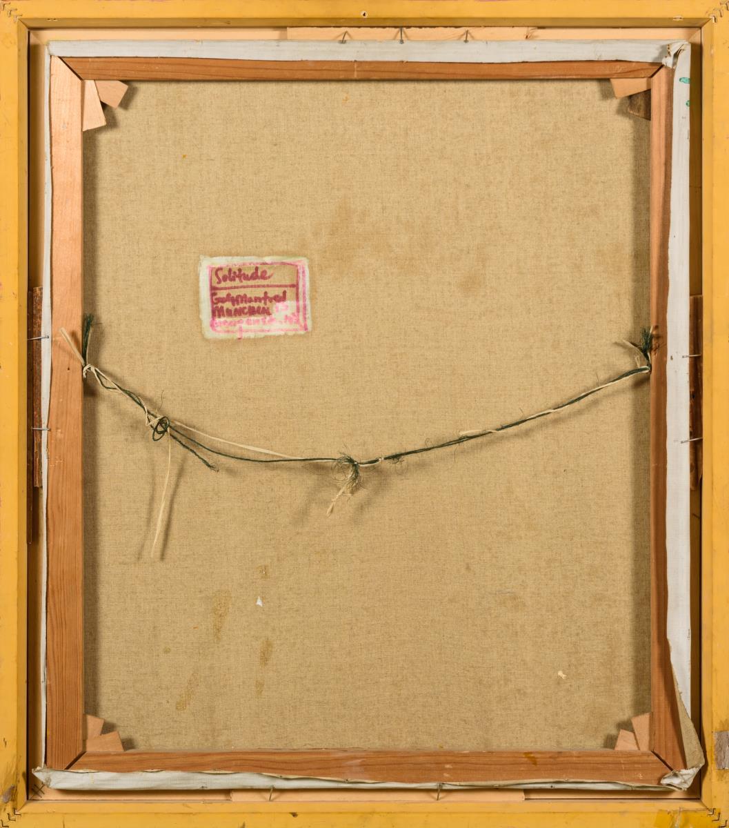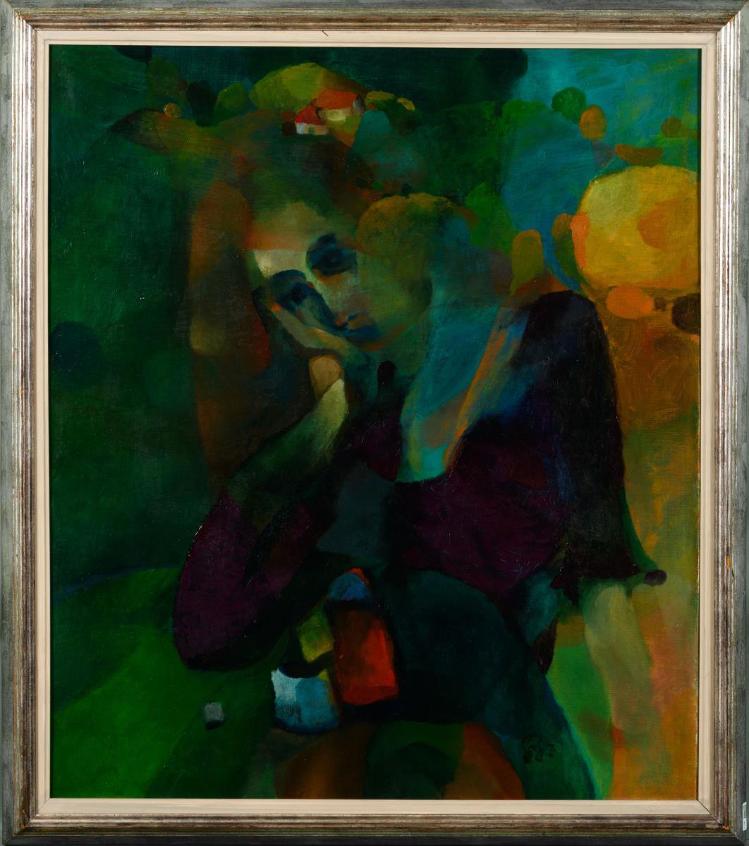 Unbekannter Maler: "Solitude" Öl/Leinwand. Rechts unten undeutlich signiert, verso als "Manfred Goll" bezeichnet/betitelt mit Zusatz München. 60 x 70. Gerahmt: 78 x 69 cm. Abstraktes Frauenbildnis in leuchtenden Farben..