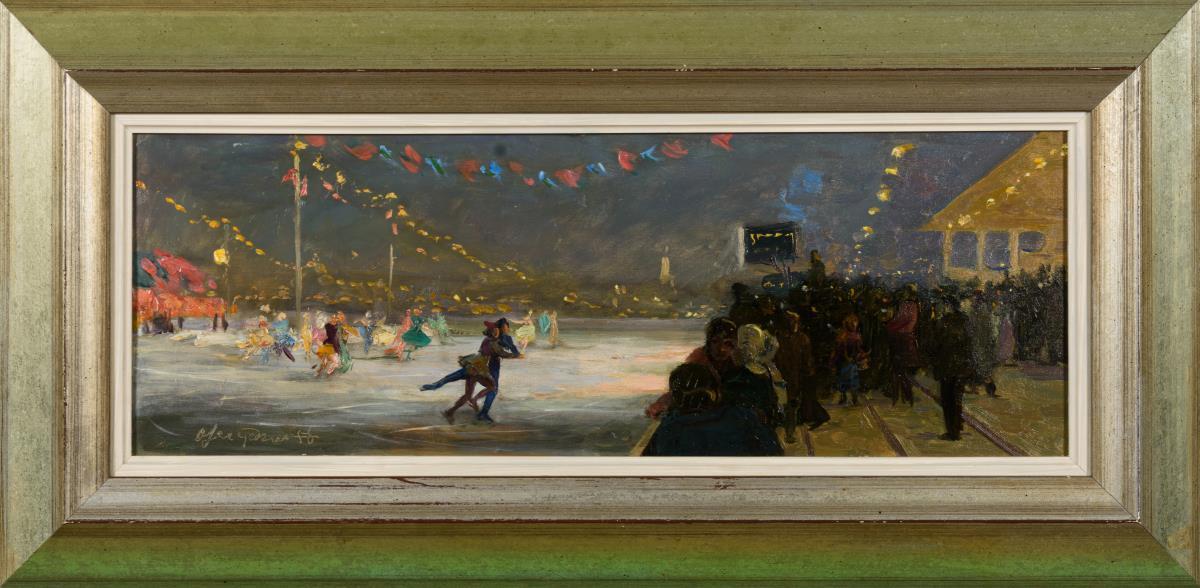 Eistänzer auf der Bahn, umringt von vielen Zuschauern.