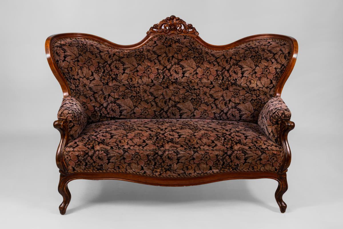 Alters-/Gebrauchsspuren, Furnier mit kleinen Defekten, alt ergänzter Bezug verschlissen.