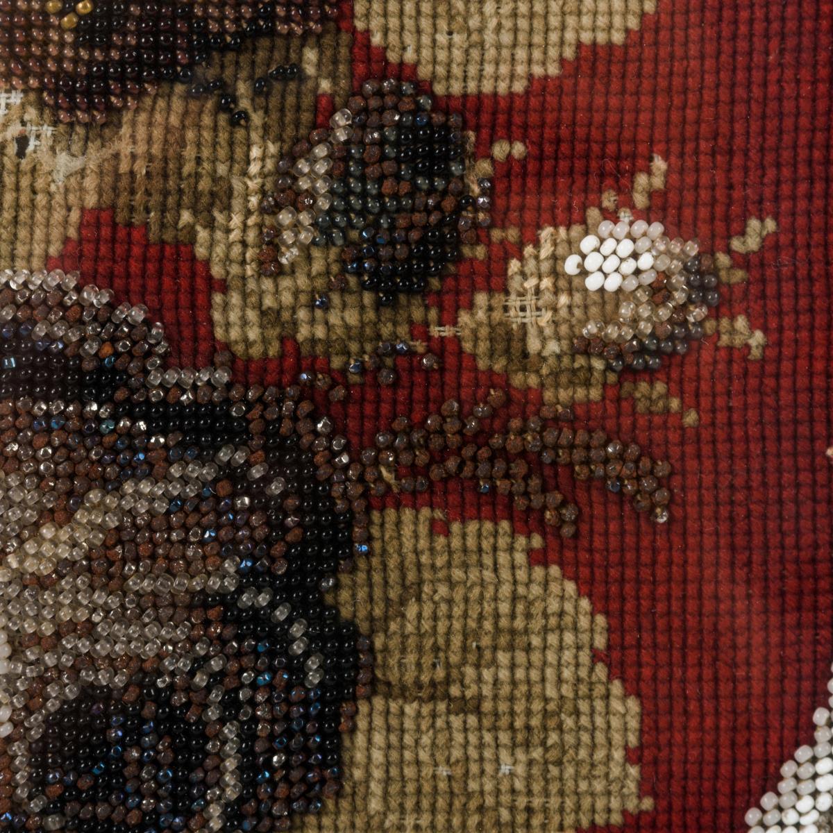 Farbige Glas- und Metallperlen, farbig gestickter Grund.