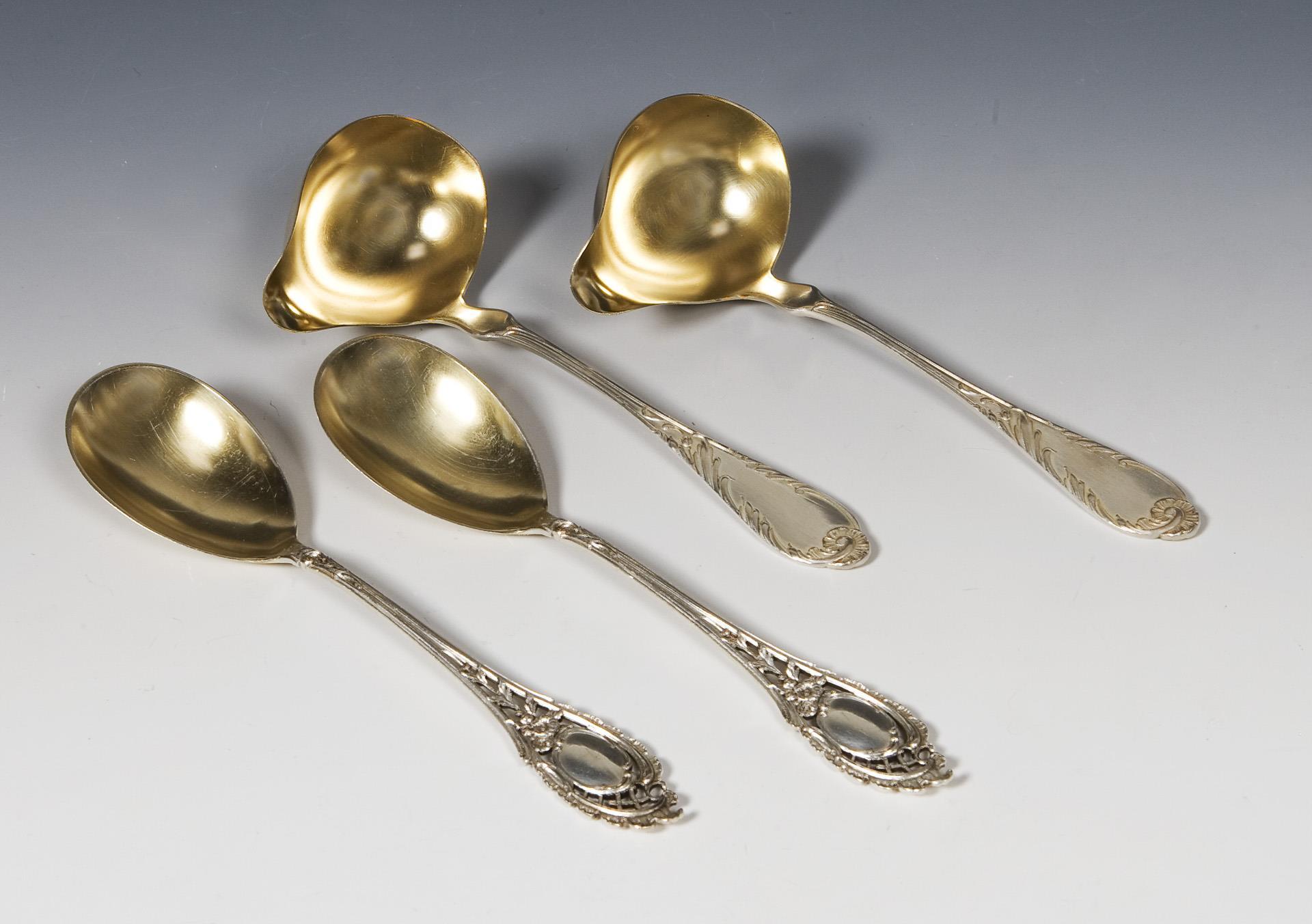 4 pieces of serving cutlery: 1 pair of sauce ladles, 1 pair of spoons. Koch & Bergfeld, Bremen and Gebrüder Köberlin, Döbeln.