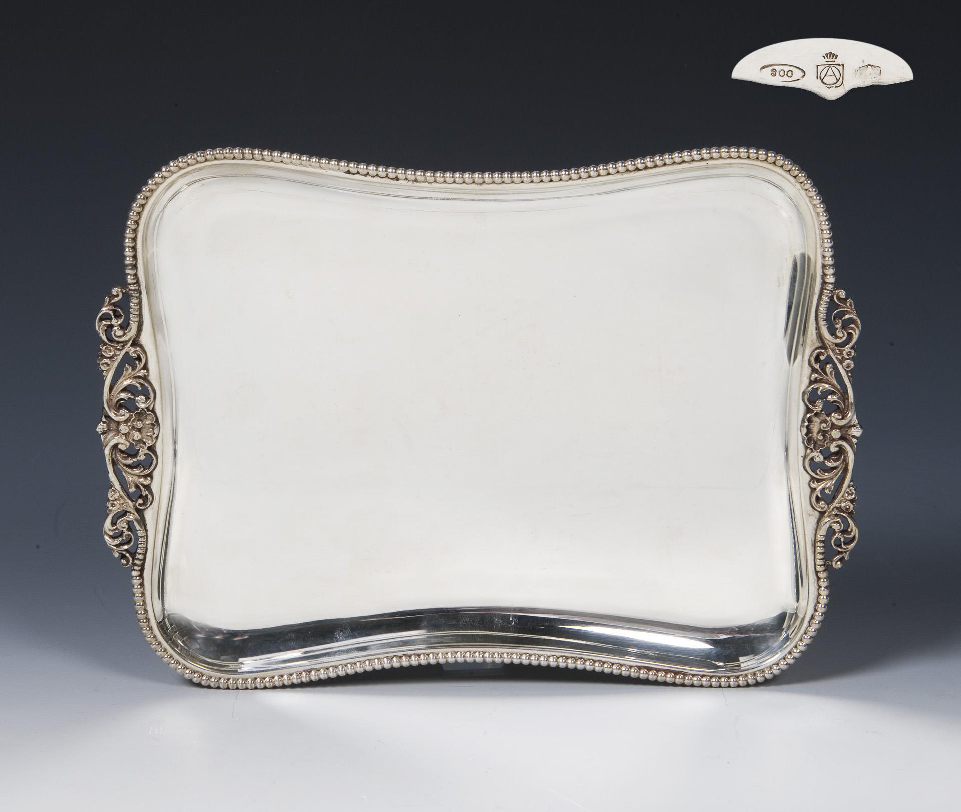 Curved rectangular shape with pearl border in relief, open-worked handles on the sides. Hallmarks: Fineness, maker's mark. Partial scratches.