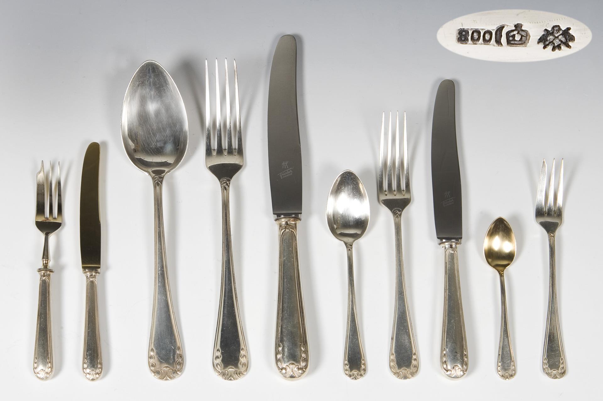Floral relief on both sides. 130 pieces: 12 knives, 12 forks, 12 tablespoons, 10 dinner knives, 10 dinner forks, 24 dessert knives, 12 dessert forks, 12 coffee spoons, 6 cake forks, 11 demitasse spoons, 1 sauce ladle, 2 different serving spoons, butter knife, cheese knife, 2 large serving forks, 2 small serving forks. Hallmarks: Crescent and crown, fineness, maker's mark.
