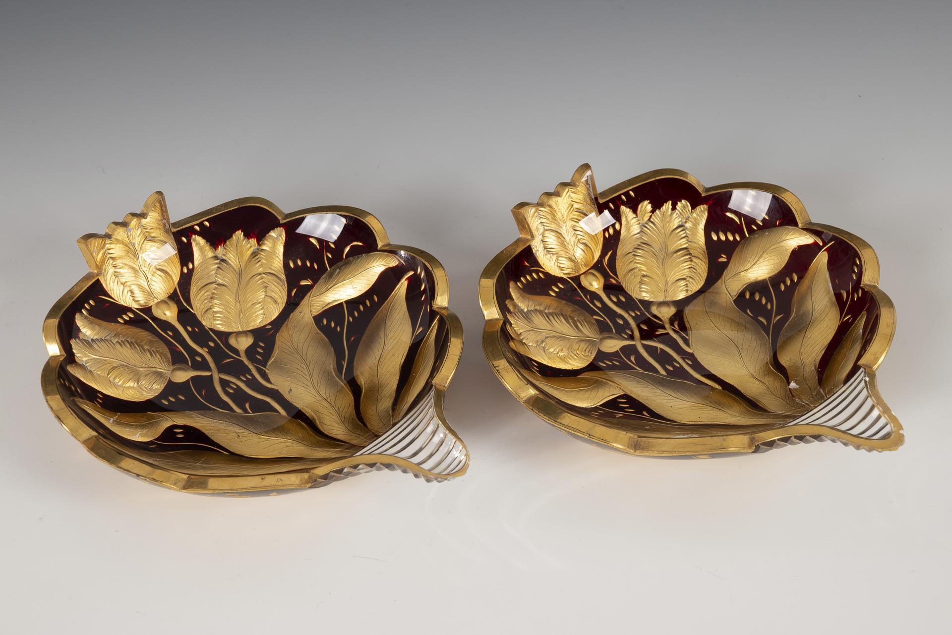 Multi-pass bowls with deep-cut, gilded tulip bouquet on the underside. Partial minimal gold abrasion, 1x with 3 rim chips.