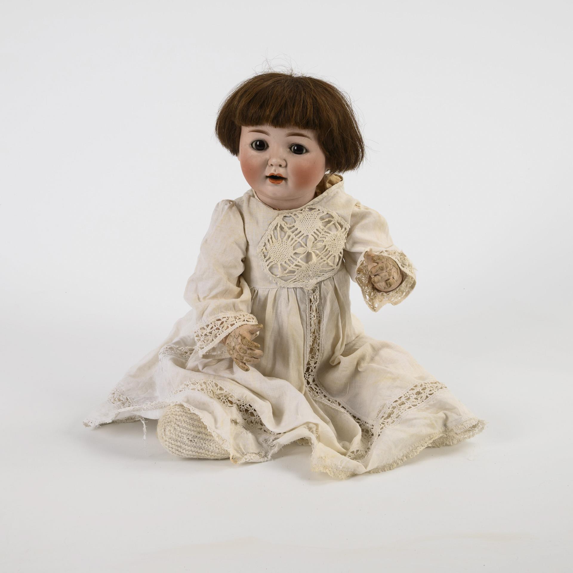Cranked head, brown sleeping eyes, brown real hair wig. 5-part sitting baby body. White dress, white crochet shoes. Breakout on the head crank, body with defects.