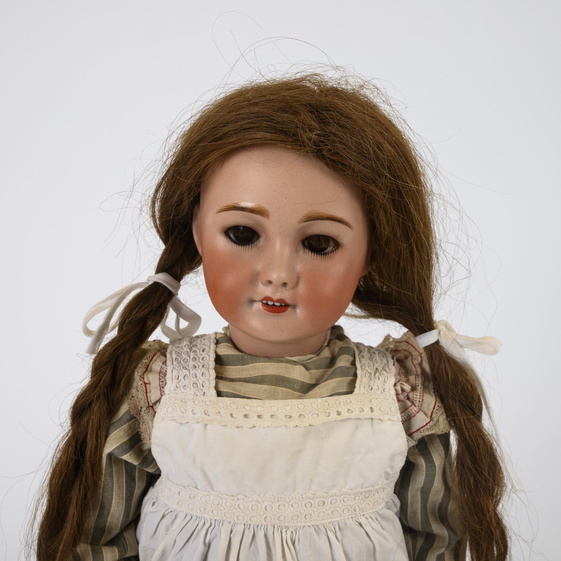 Cranked head, brown sleeping eyes, eyelashes, real hair wig, 11-part jointed body, striped dress with white apron, white leather shoes. Head x-rayed: without defects. 2 fingers minimally retouched.