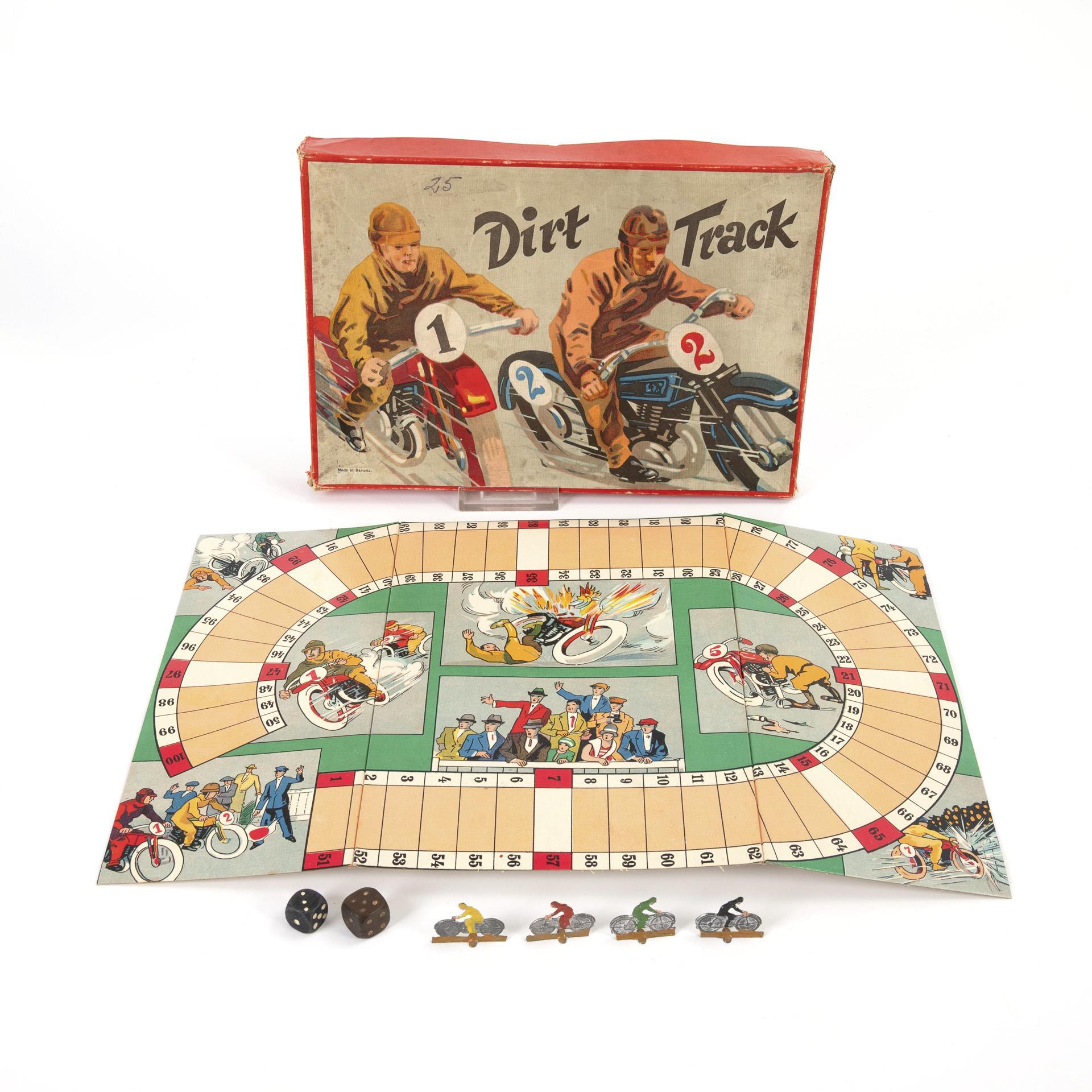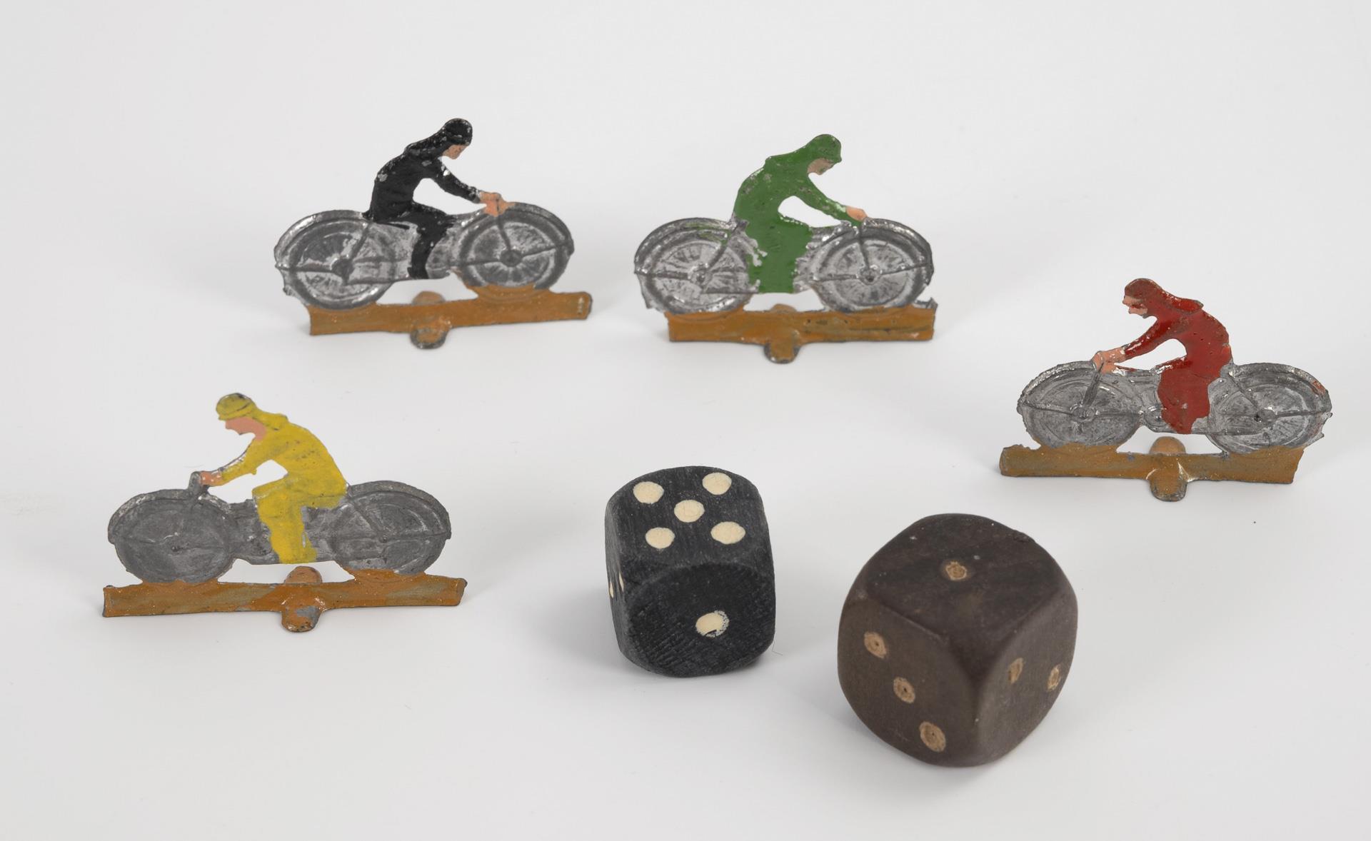 Motorcycle racing game with 4 old tin motorcycles and 2 dice. For the English-speaking market (English game instructions in the lid). Cardboard box with minor defects.
