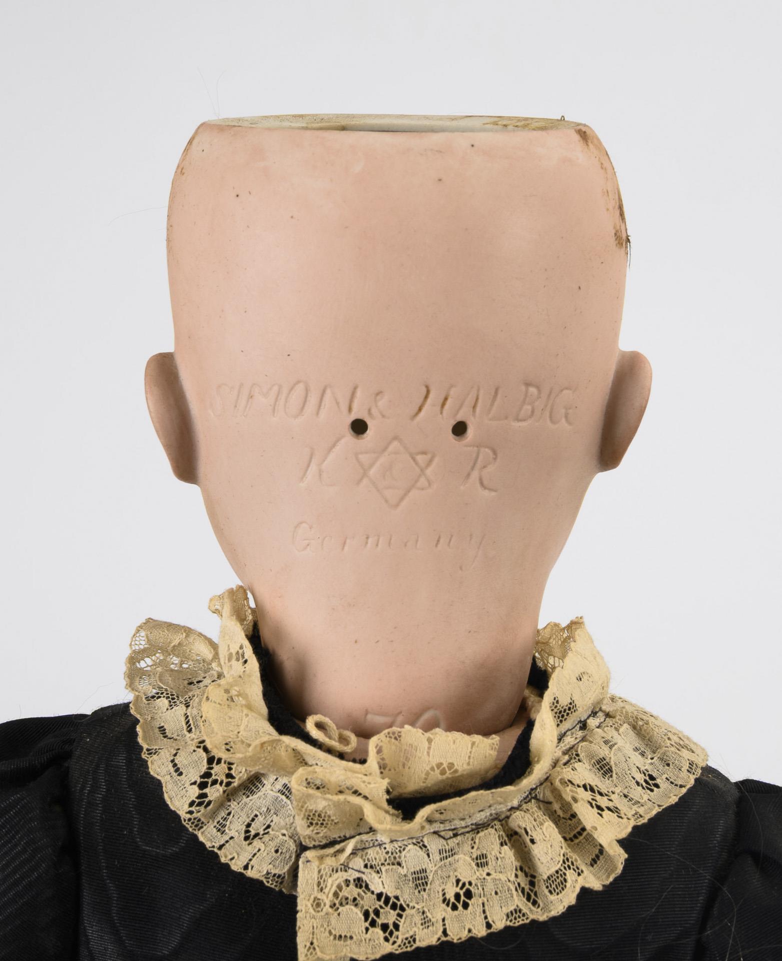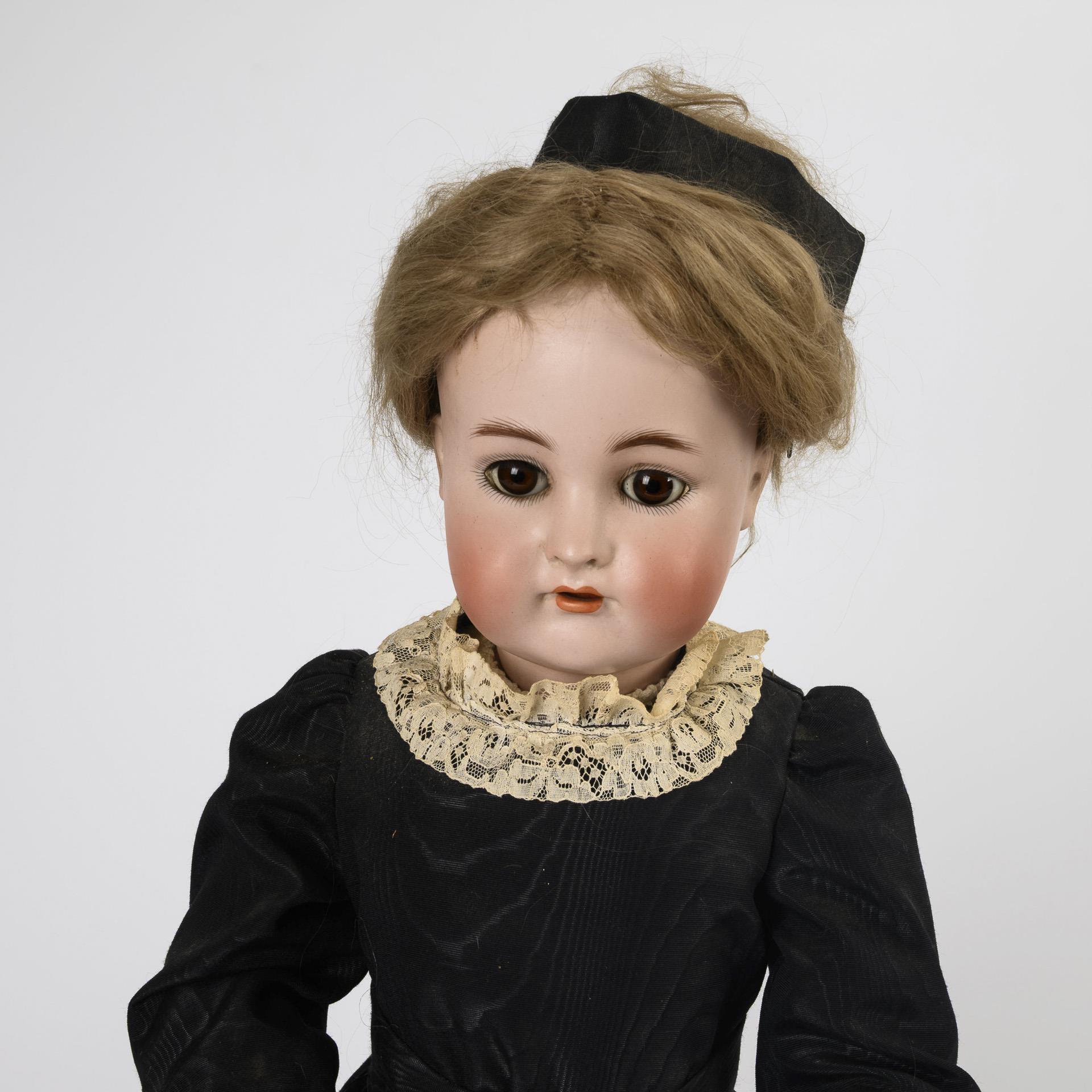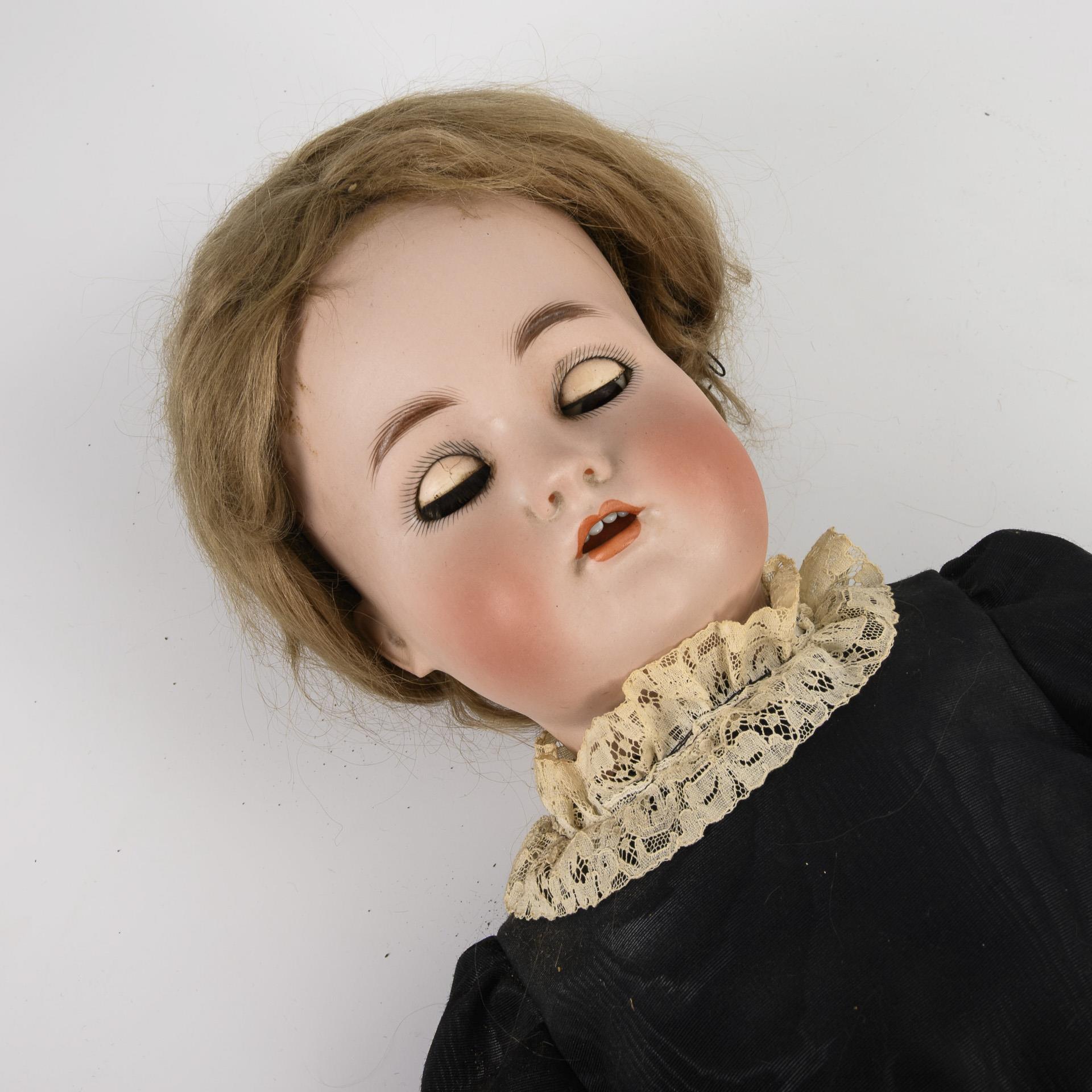 Cranked head, brown sleeping eyes, blond mohair wig, 17-part jointed body. Black dress with lace trim, old white shoes. Head x-rayed: without defects. Right foot chipped.