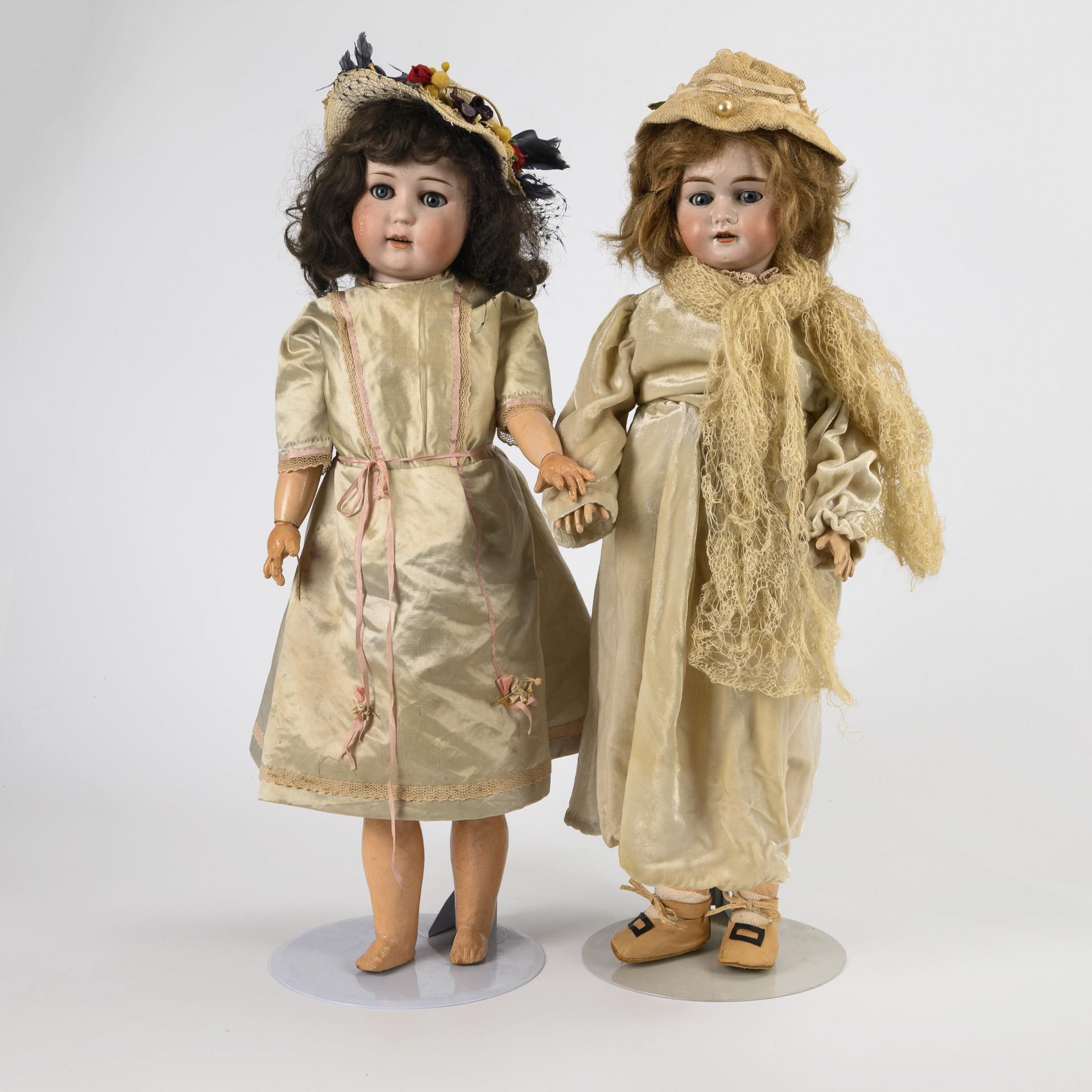 Both with crank head, blue sleeping eyes, artificial hair wig, multi-part jointed body and light, shiny dress. 1x "Mignon", l 61 cm, 1x F & W. Goebel "120", l 62 cm. 1x with scratches to the cheek and minimal wig pull.