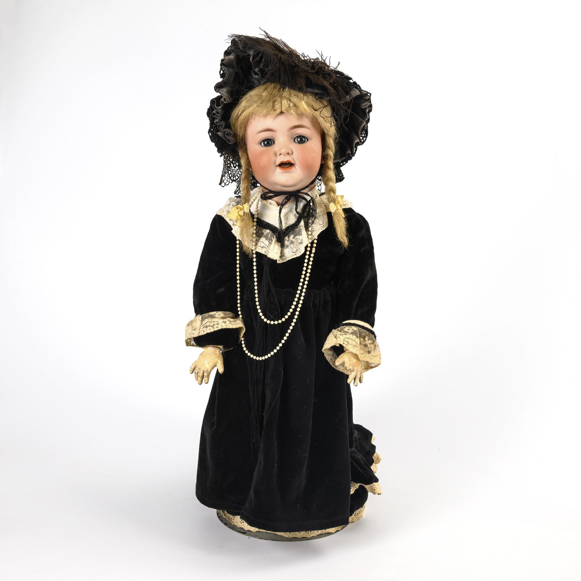 Cranked head, blue sleeping/shelmet eyes, open mouth, blond artificial hair wig with plaits. 15-part toddler body. Black velvet dress, pearl necklace and feather hat. Head x-rayed: without defects, only minimal wig pull. 1 eye loosened, 1 finger defective.