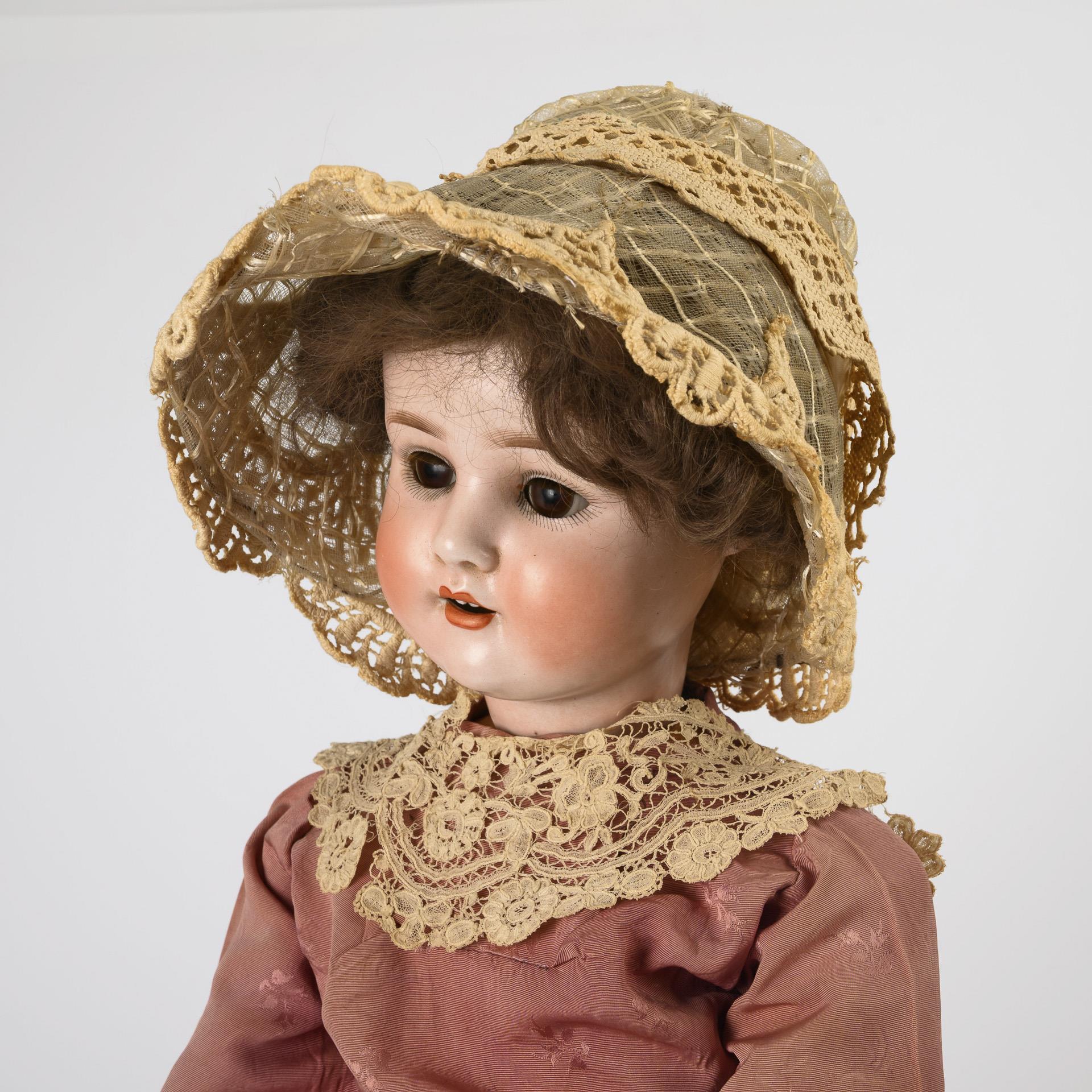 All with cranked head, sleeping eyes, brown wig and jointed body. 1x Schoenau & Hoffmeister (914) with dusky pink dress and hood, l 74 cm. / 1x Max Oskar Arnold (MOA 201) with wine-red velvet dress, l 56 cm. / 1x Armand Marseille (AM 390) in mustard-colored velvet costume, L 56 cm. With defects to heads and bodies.