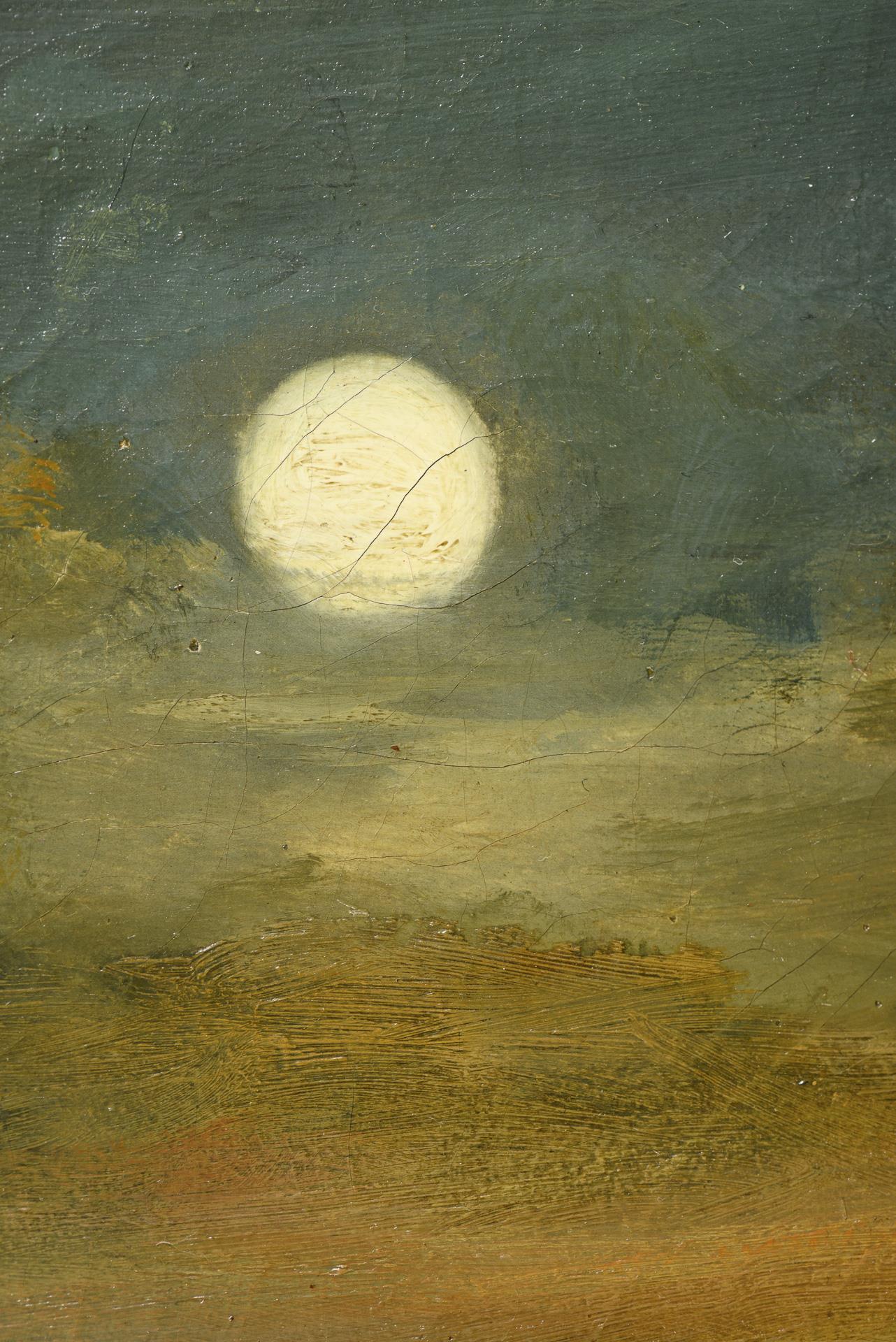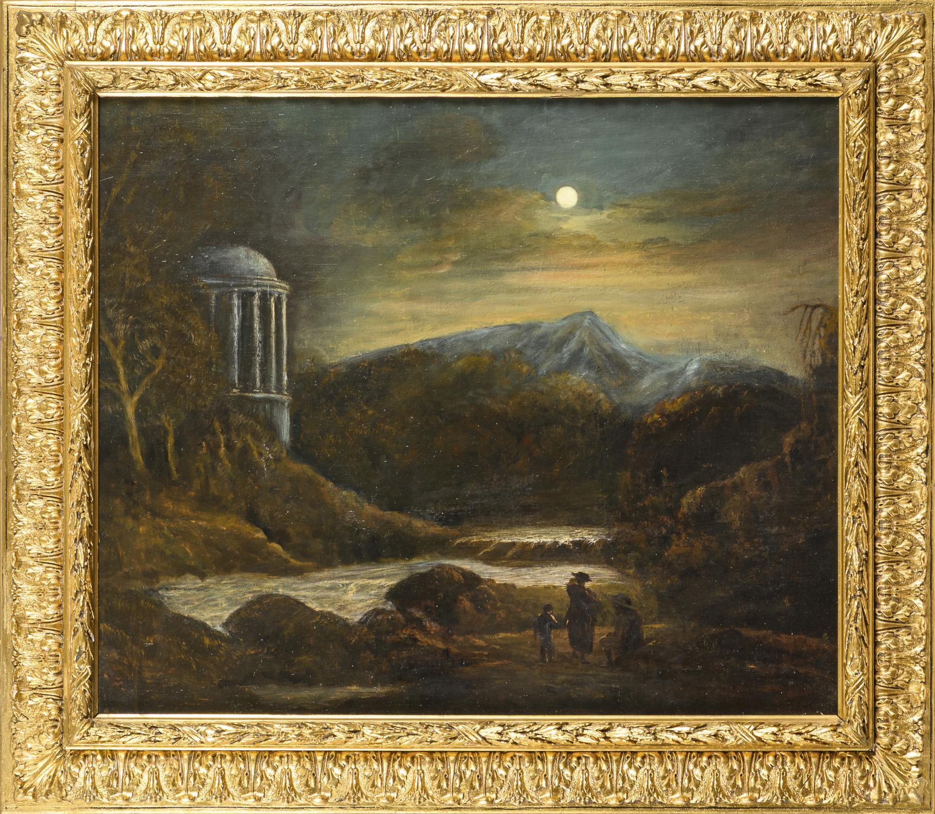 Staffage figures near a river contemplating the moon over the mountainous landscape. Slight traces of age.