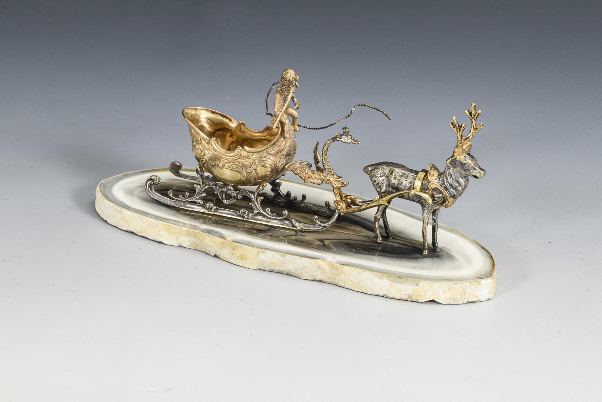 A magnificent carriage with putto and harnessed stag, on an oval stone plate. Plate with hairline cracks and 2 chips.