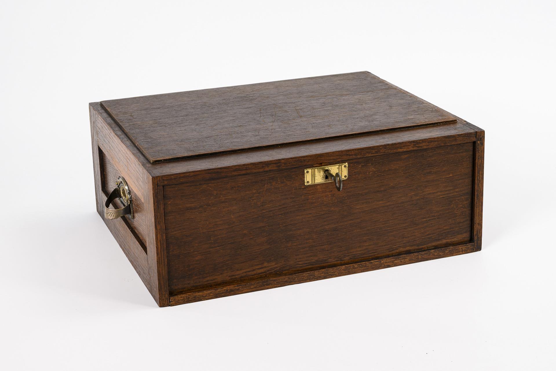 Solid oak, stained dark, drawers with black leather, brass fittings. 14 x 36 x 30 cm. 4.6 kg.