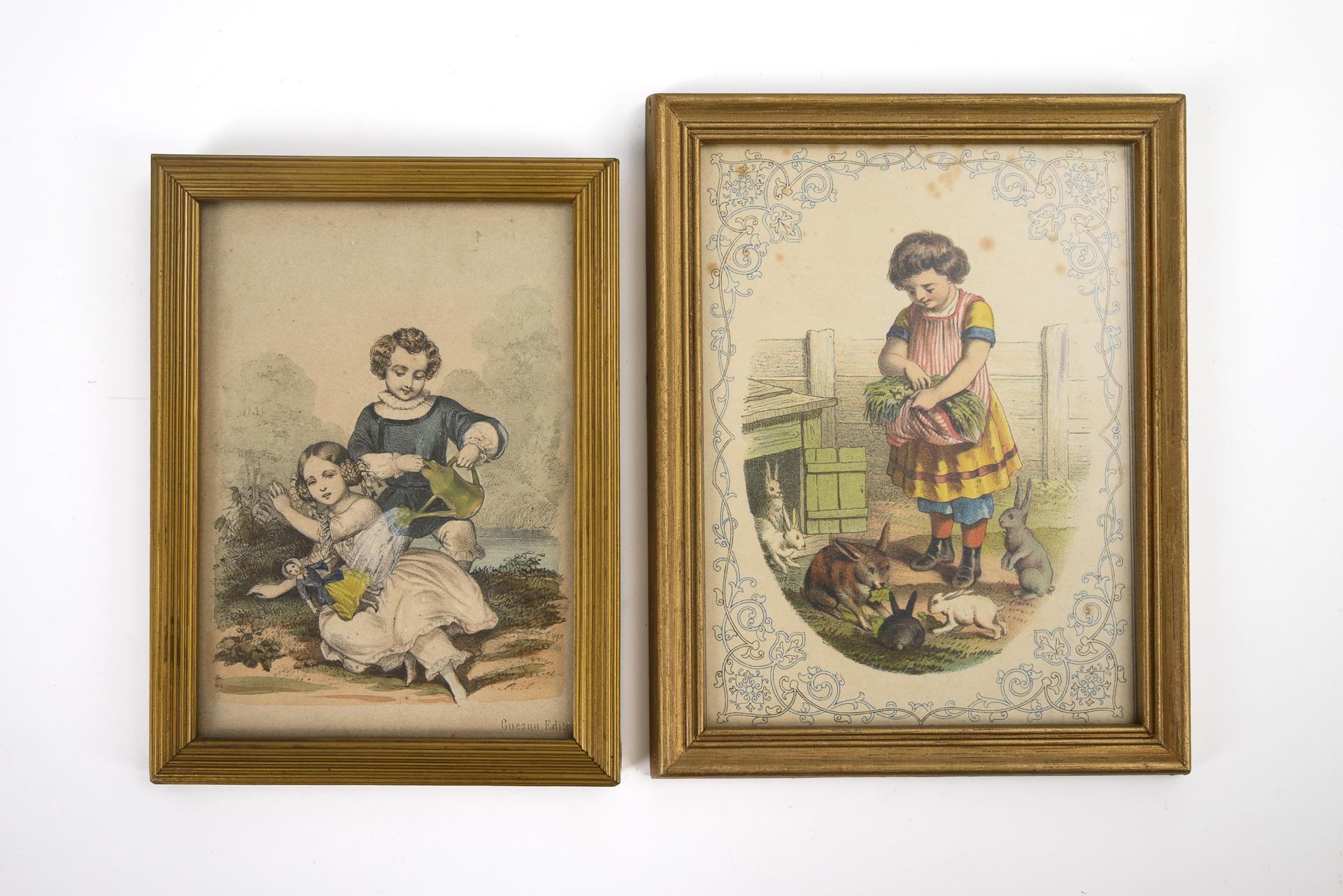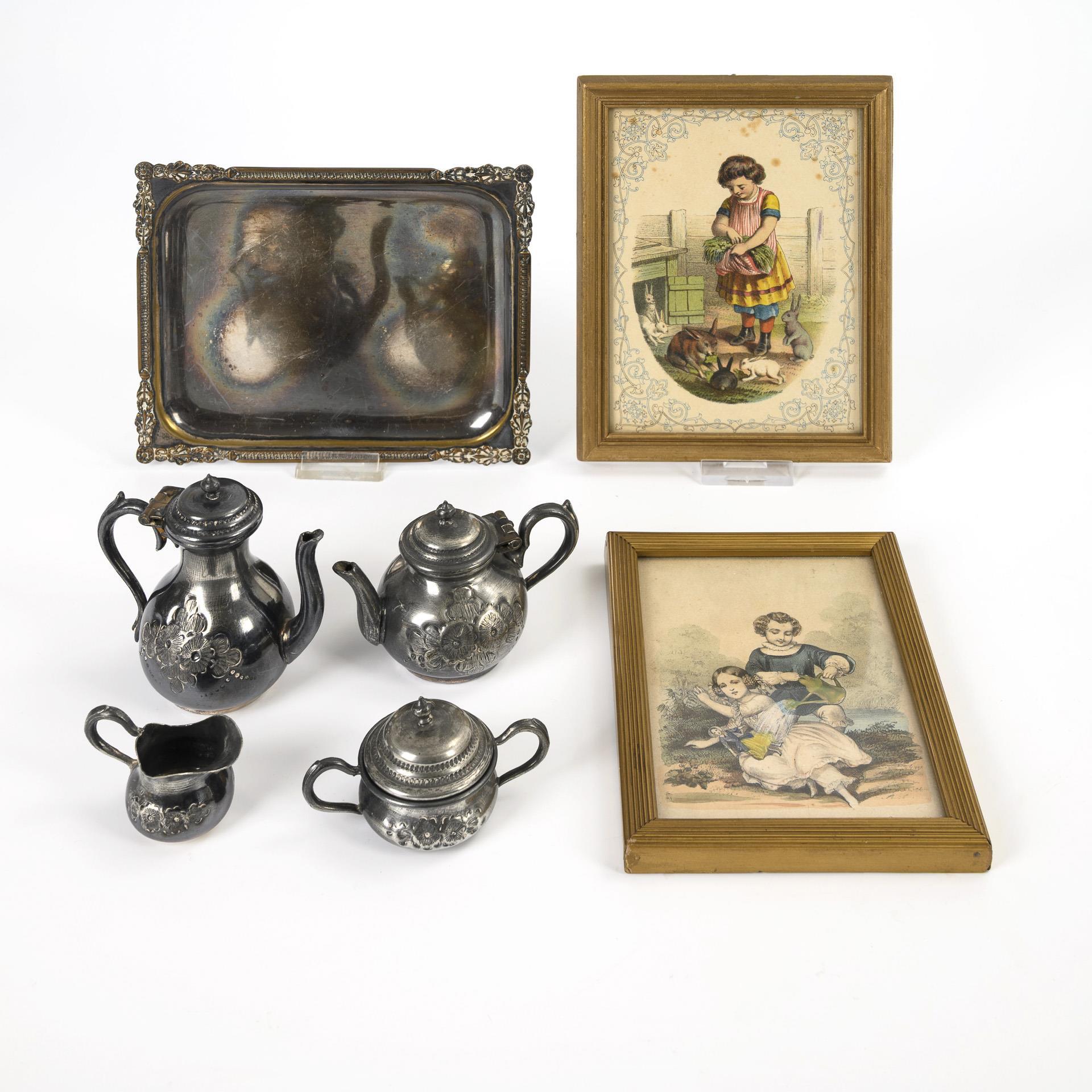 4-part centerpiece with floral relief: Coffee pot, teapot, milk jug and sugar bowl. H 3.5 - 9 cm. / Rectangular tray, 14.5 x 17.5 cm. / 2 framed pictures of children. Age blackened, silver plating on tray rim rubbed.