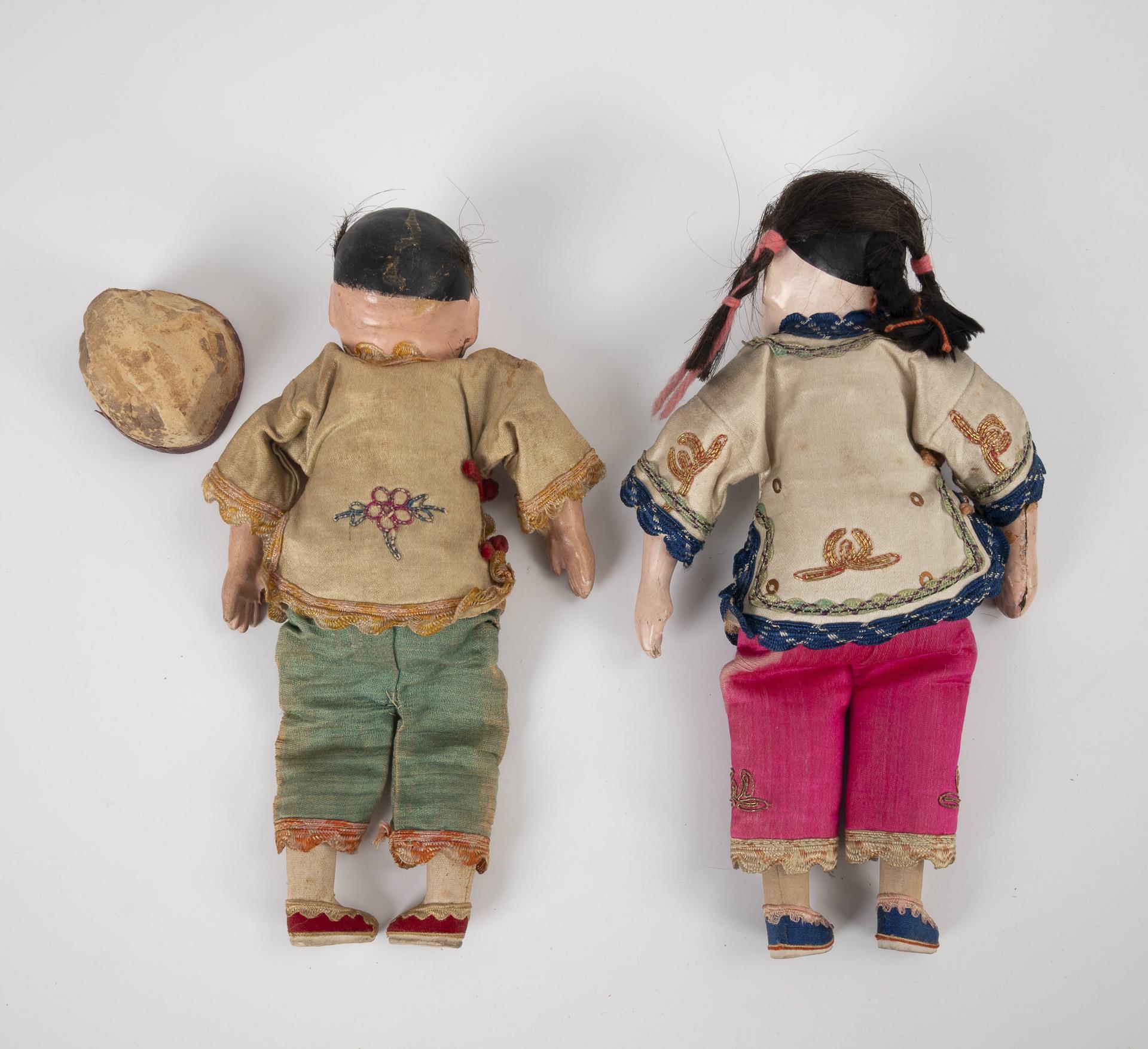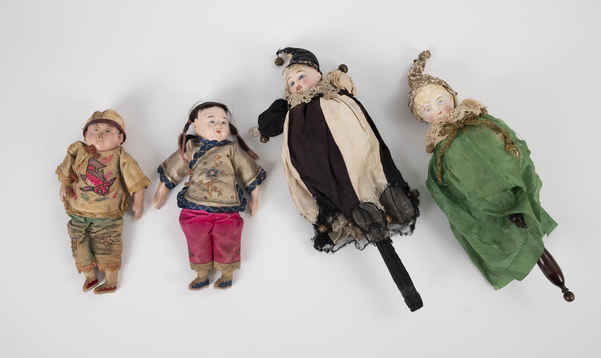 Marotte with black and white robe without musical mechanism (head mark: 1094), h 38 cm. / Marotte with green robe, spherical body and intact musical mechanism, h 36 cm. / 2 dolls with original clothes, h 22/23 cm. All with strong signs of age and small defects.