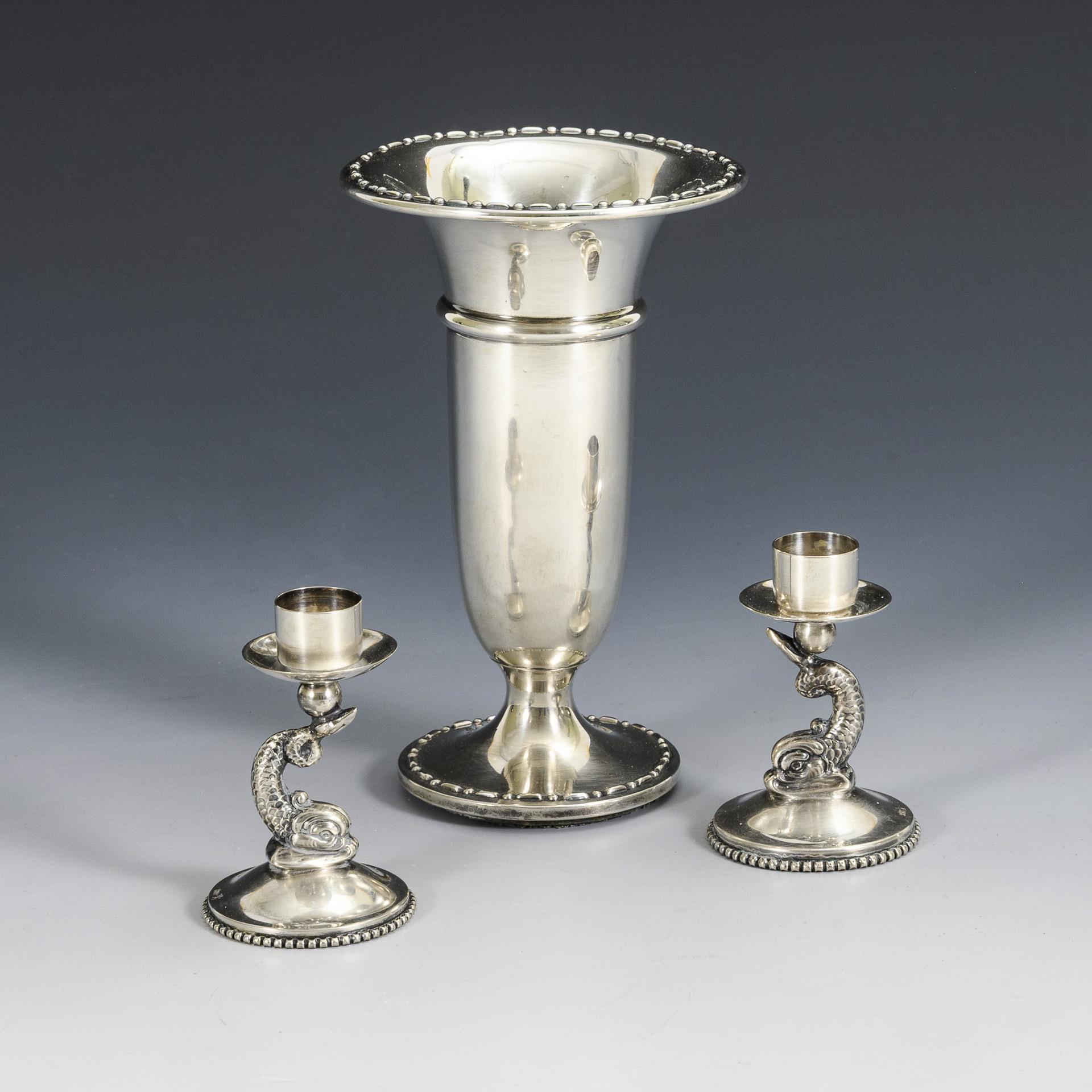 Trumpet-shaped vase (A & J Zimmermann, Birmingham) with weighted round base, h 15.5 cm. / Pair of 1-light candlesticks (Gebrüder Deyhle, Schwäbisch Gmünd), h 8 cm. Vase dented.