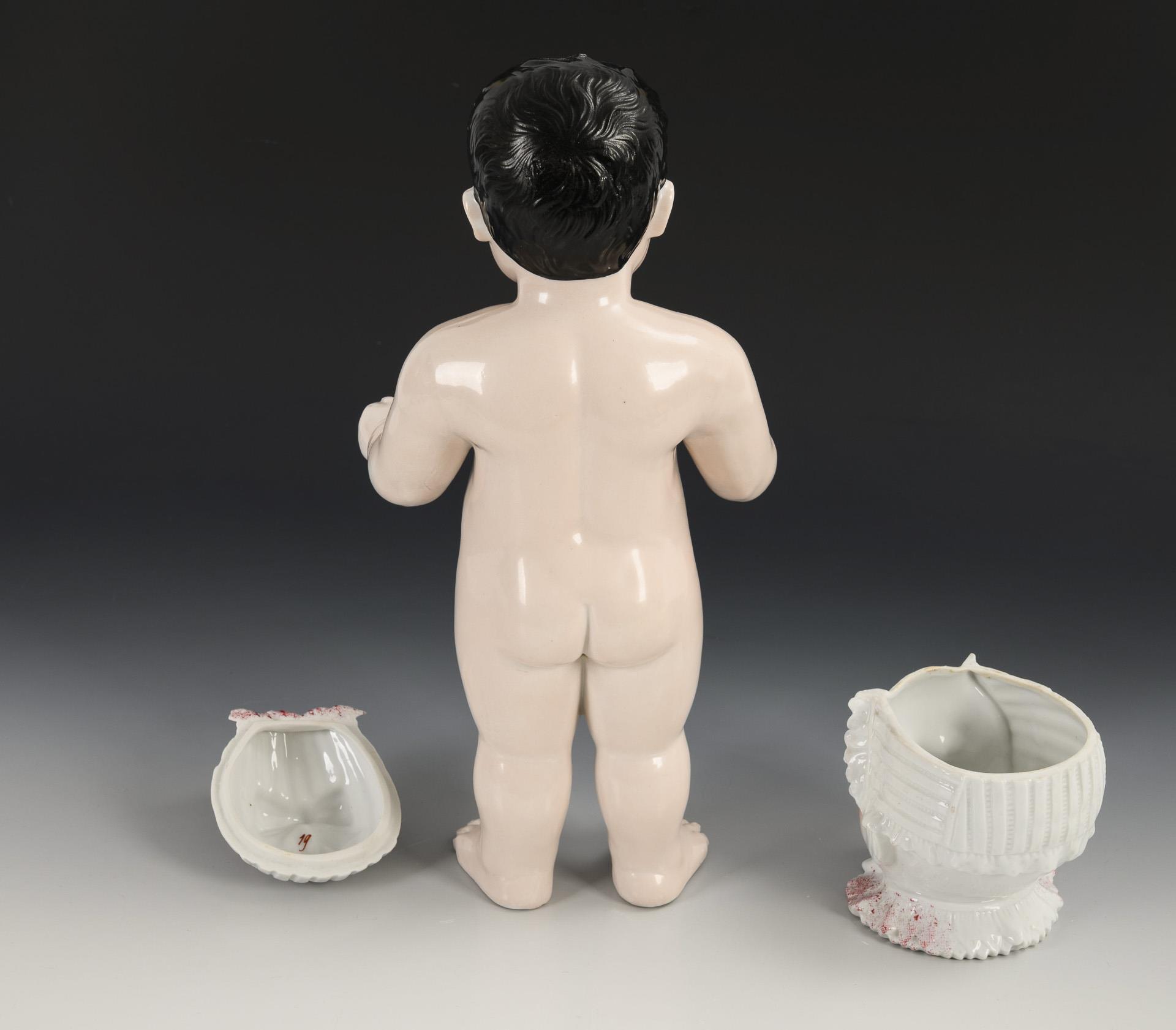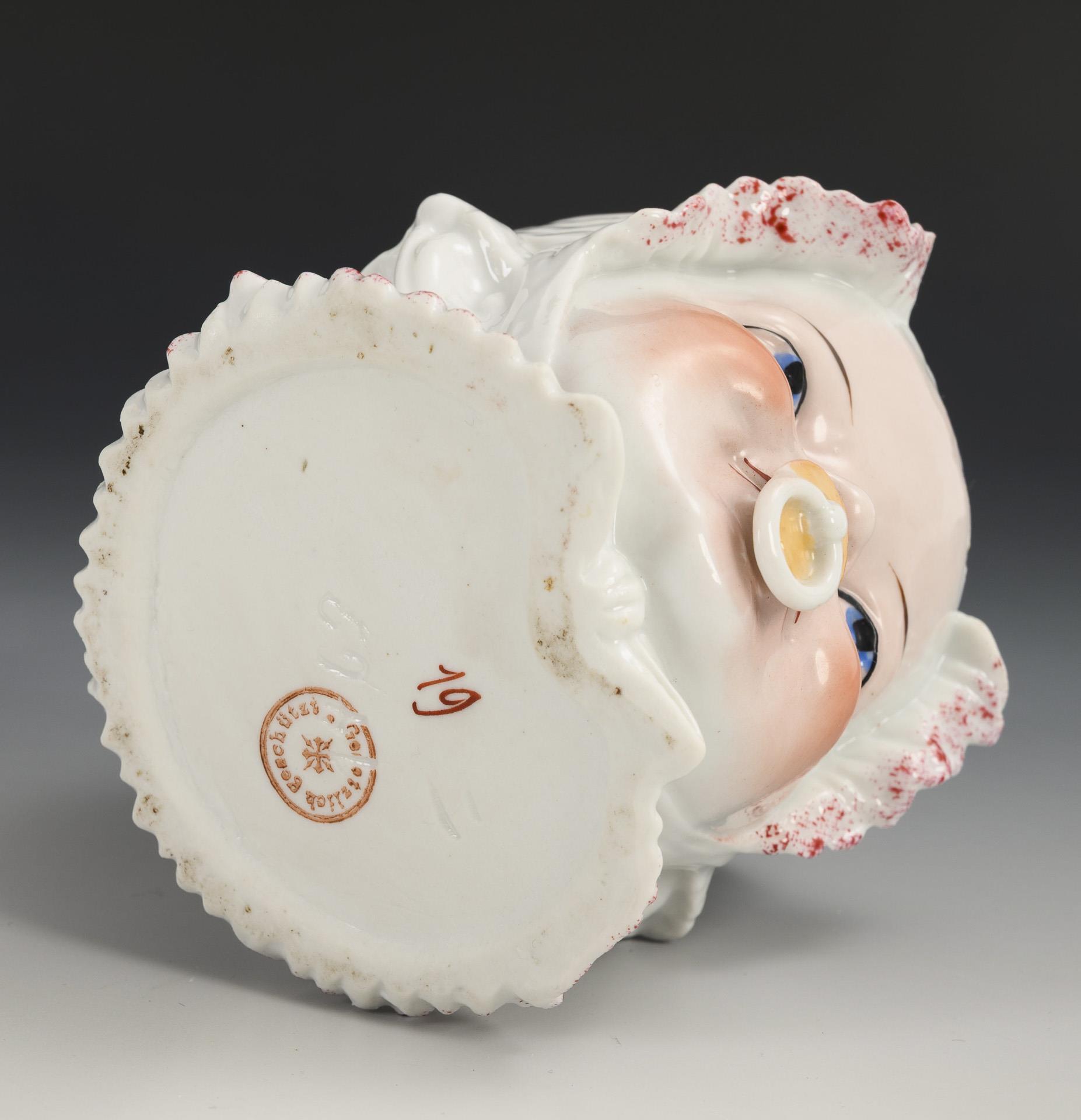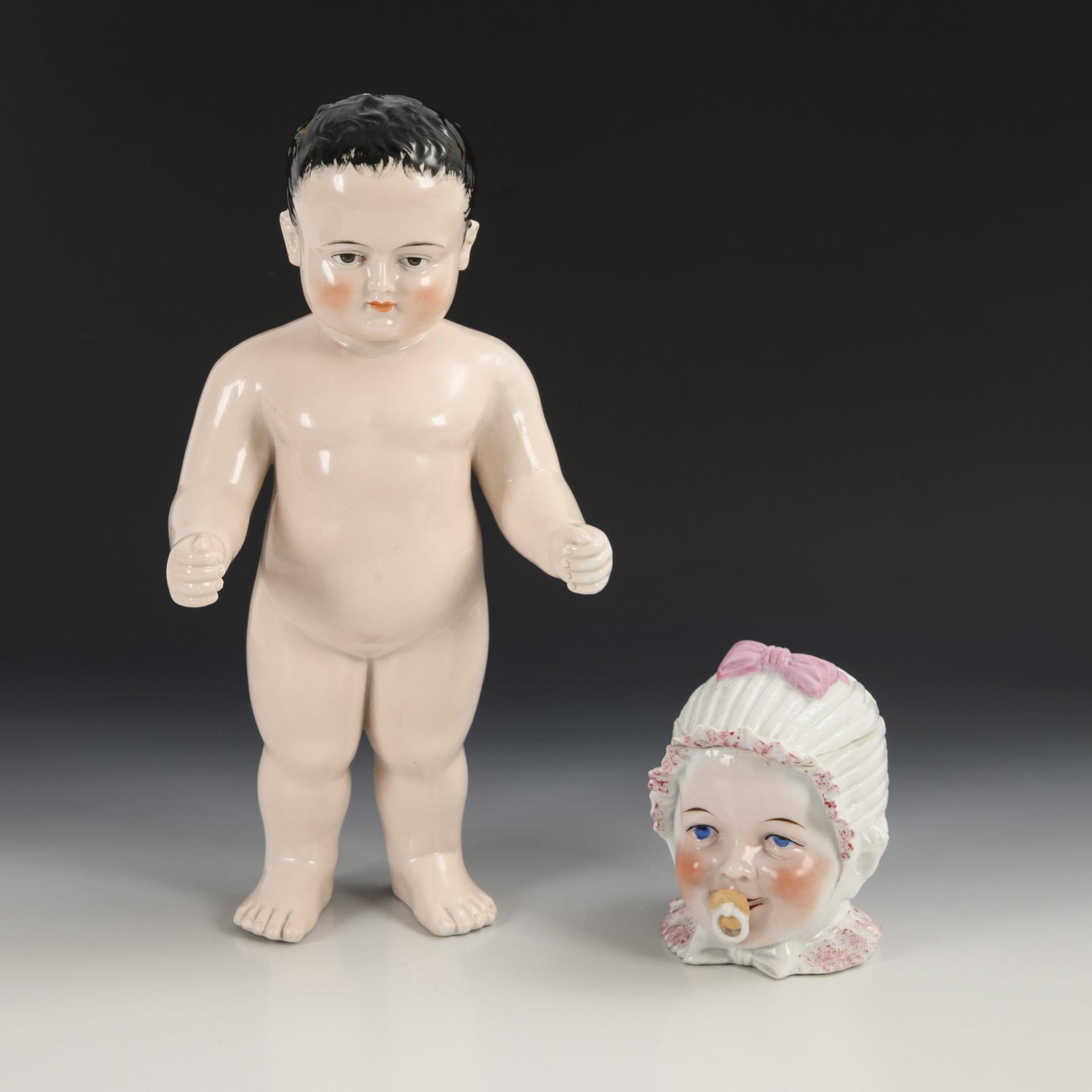 So-called naked frog or Frozen Charlotte with brown eyes and black hair, L 35 cm. / Figural porcelain box (probably Conta & Böhme, with red stamp), h 12.5 cm. Tiny chip to the ruffles of the box.