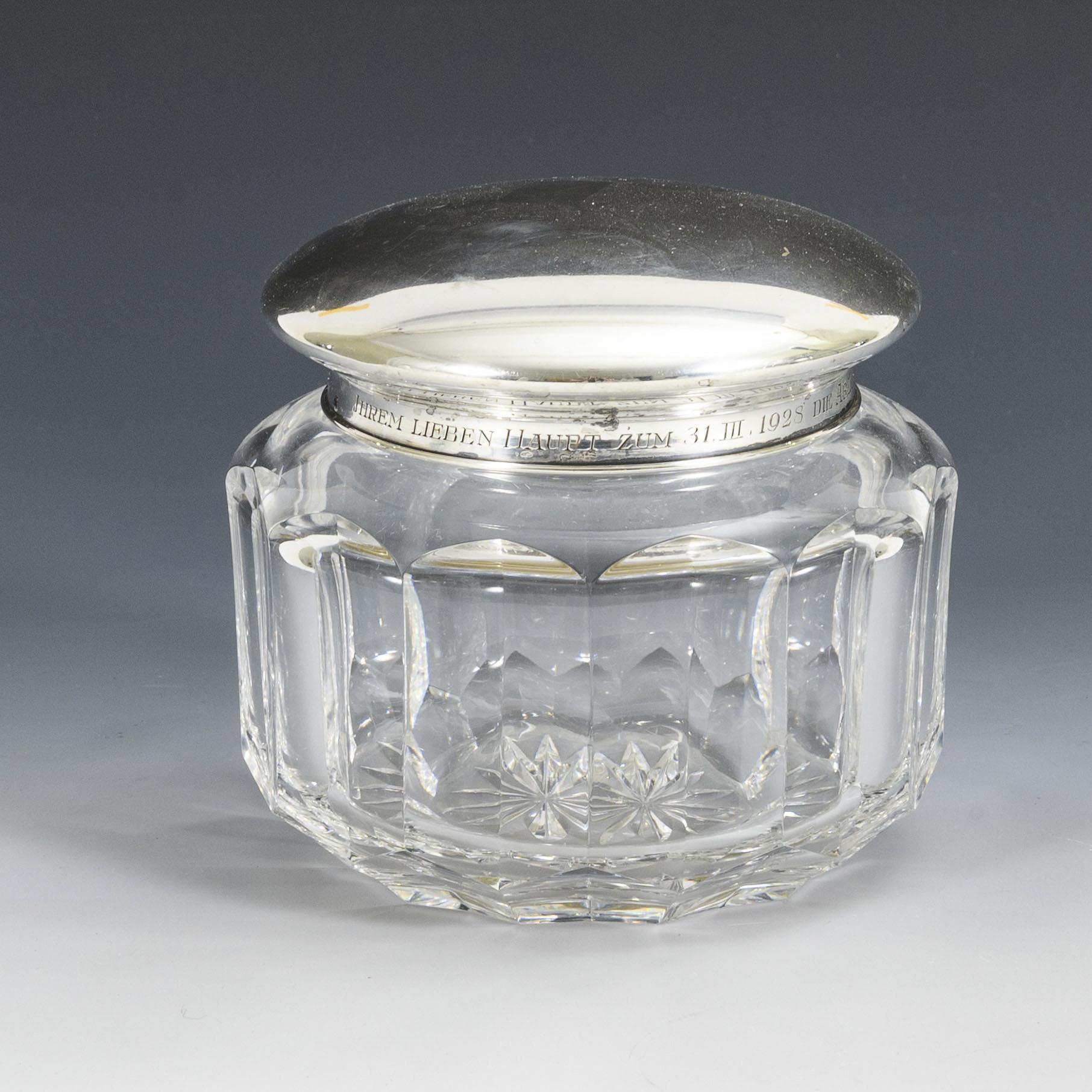 Faceted glass body and smooth silver lid with dedication engraving: "Your dear head to 31. III. 1928. The doctors of the University Women's Clinic Cologne". Few tiny chips to the facet edges, lid somewhat dented.