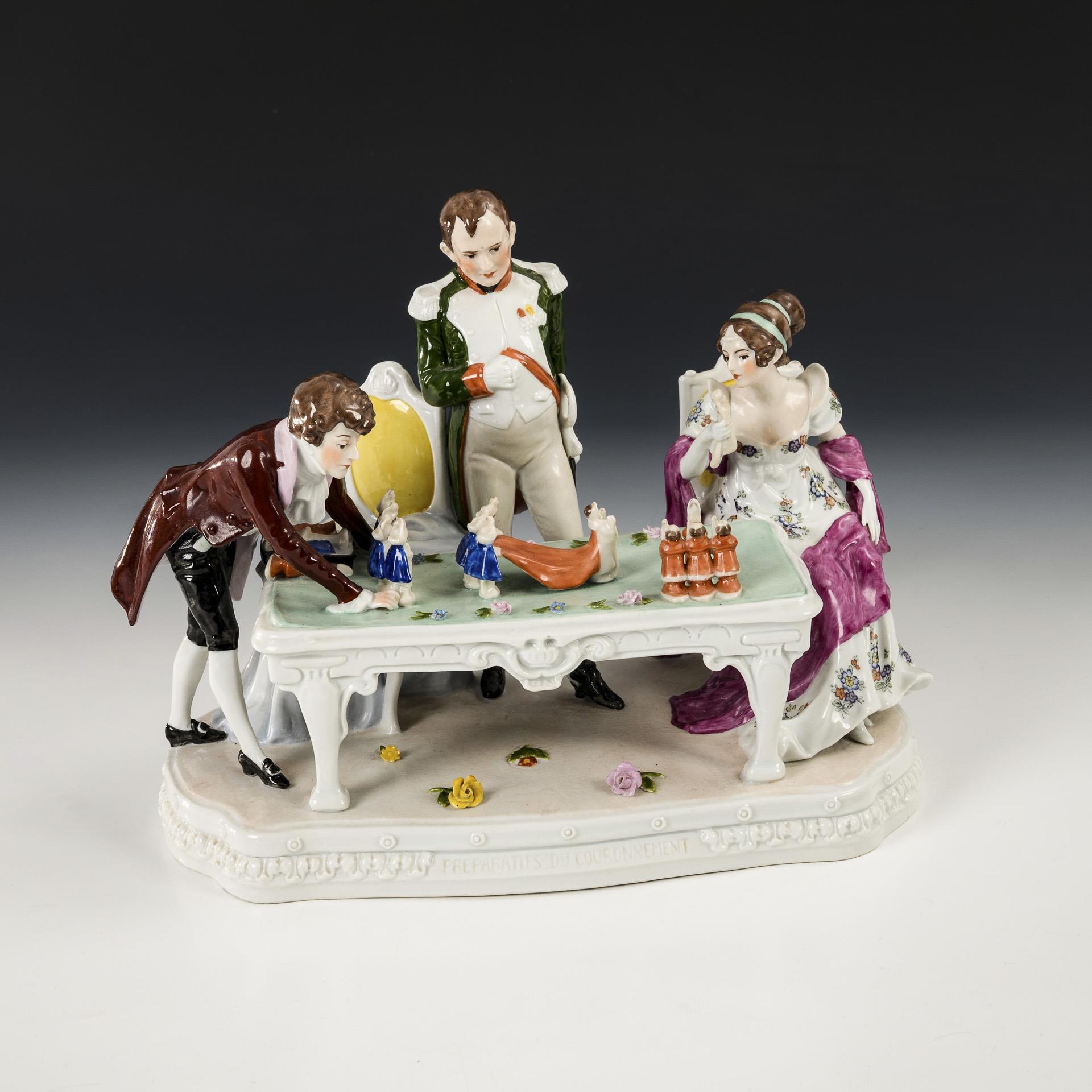 Depiction of three people grouped around a table (including Napoleon and Josephine) planning the coronation ceremony, inscribed on the front of the base "PREPARATIFS DU COURONNEMENT". 1 table figure minimally chipped.