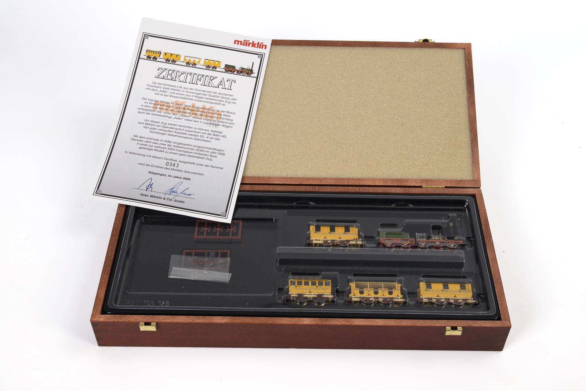 Miniature model of the "most famous locomotive from the early days of the German railroad". With certificate, in original wooden box. Small defect on one carriage.