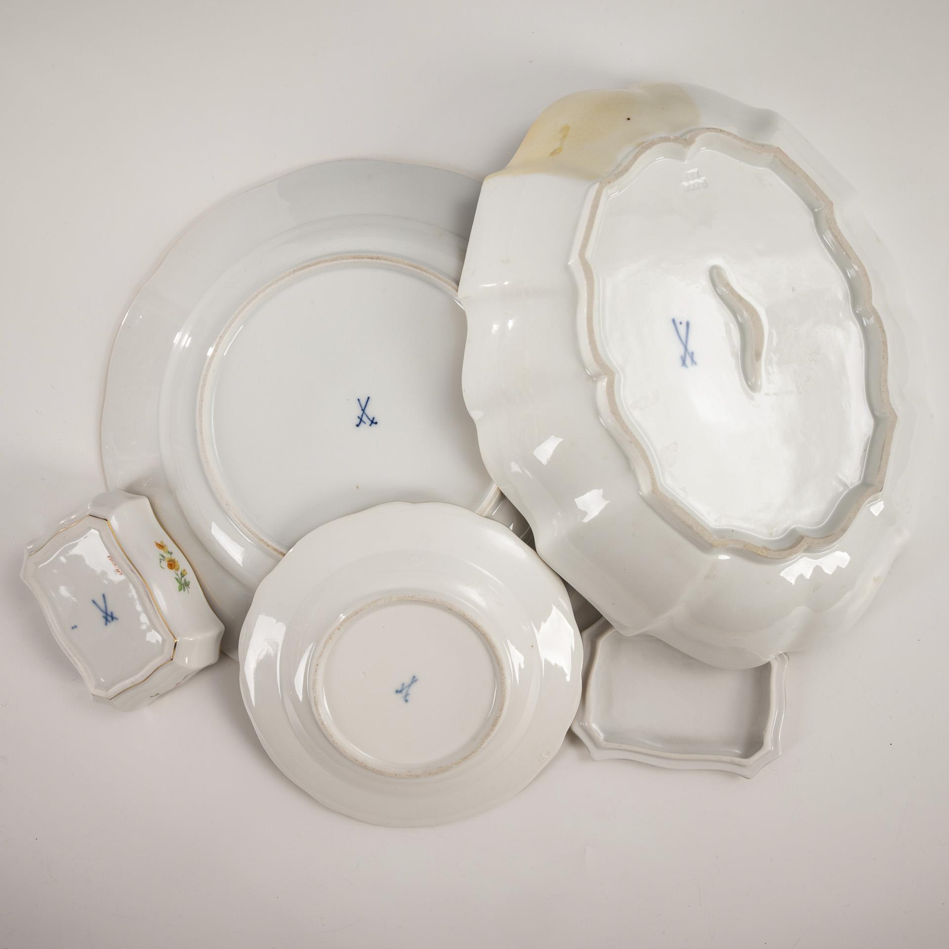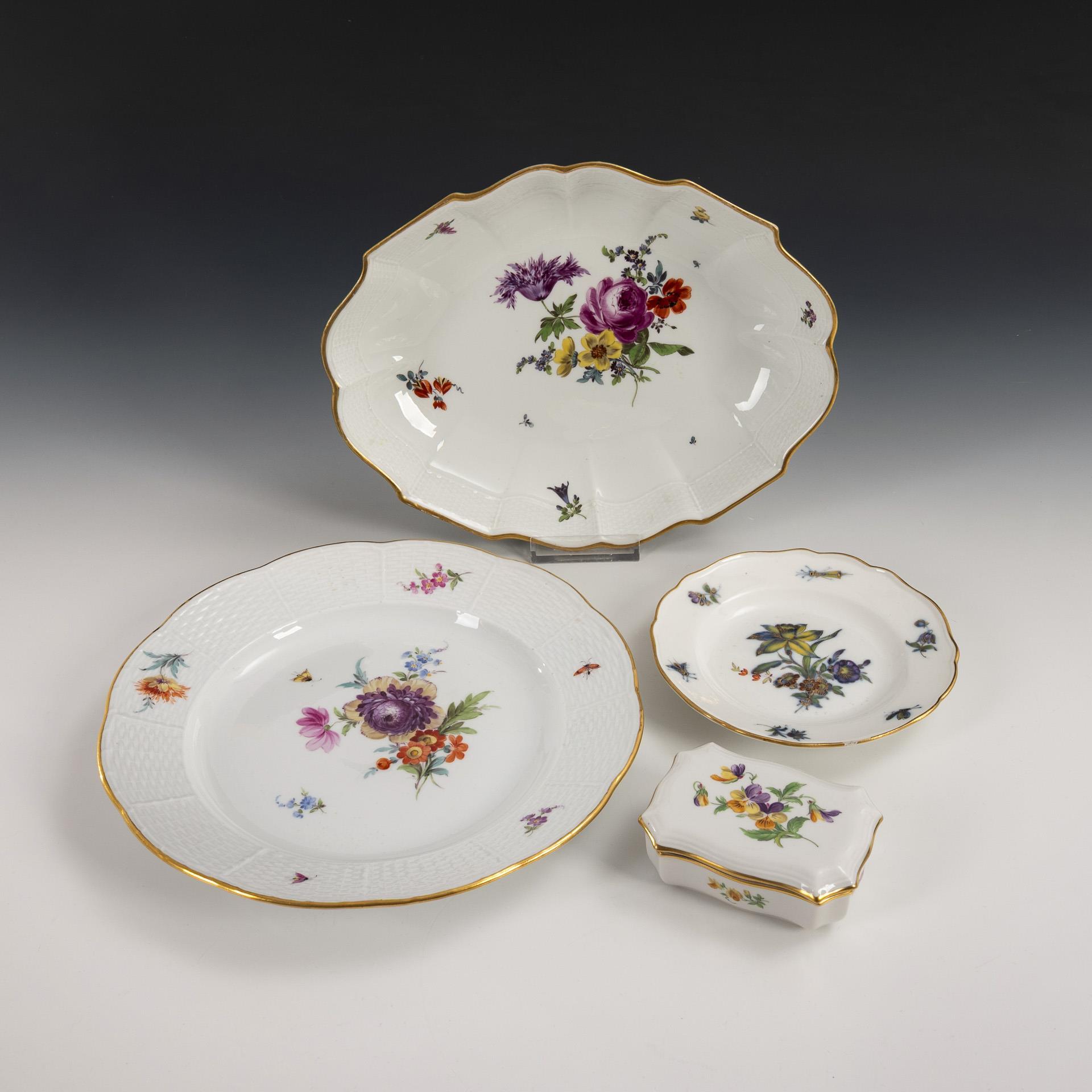 Dining plate (Ø 25 cm) and bowl (L 27 cm) in the shape "Altozier". / Plate in the shape "Neuer Ausschnitt" with underglaze blue, onglaze colored flower and insect painting (Ø 15 cm). / 1 rectangular box (3.5 x 9.5 x 7 cm). The rim of the bowl partially restored, chip to the rim of the small plate.
