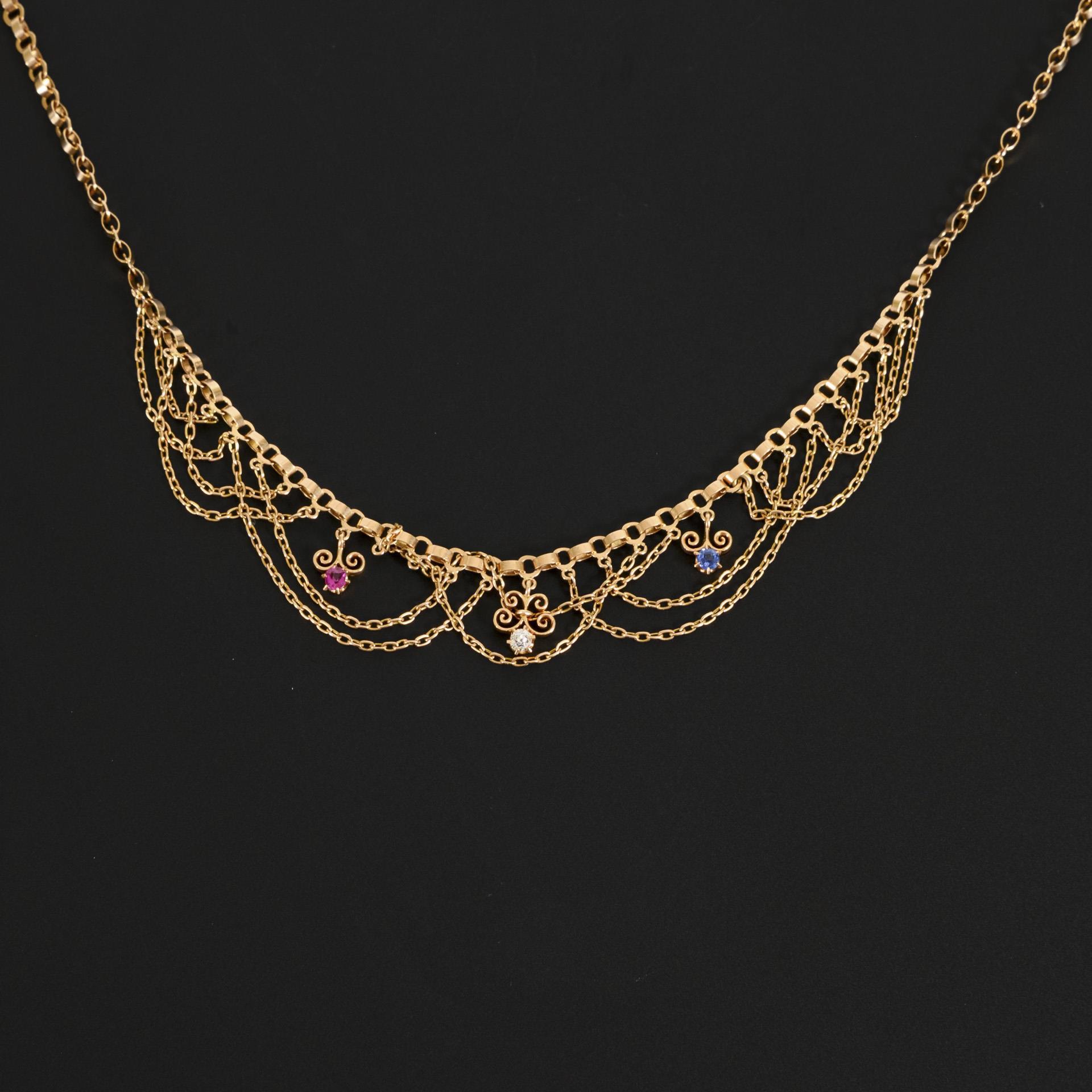 An elegant Art Nouveau necklace typical of the period with overlapping chain suspensions and 3 decorative elements, these set with a blue colored stone, probably sapphire, an old-cut diamond and a red colored stone, probably ruby. A suspension chain with repair on the back.