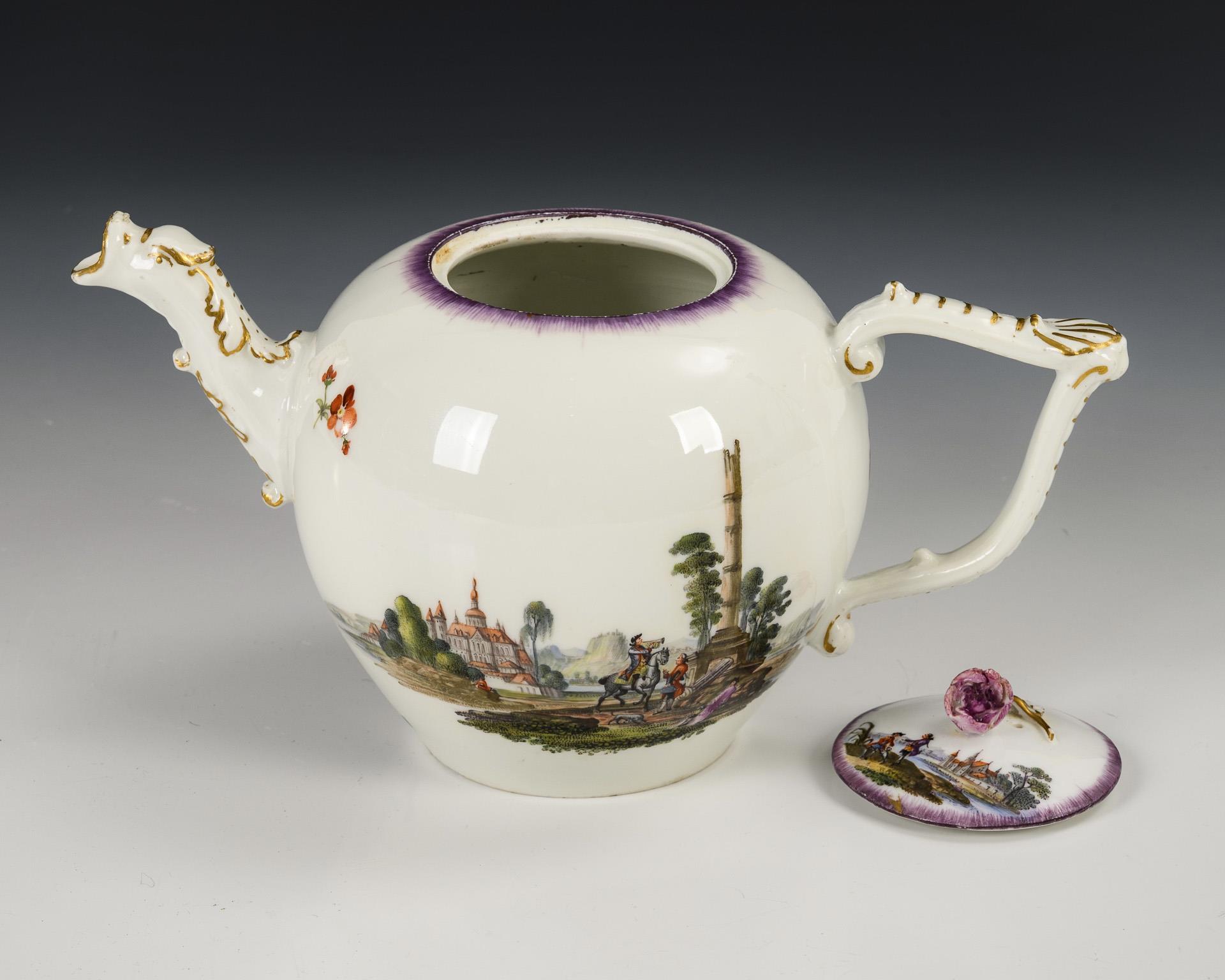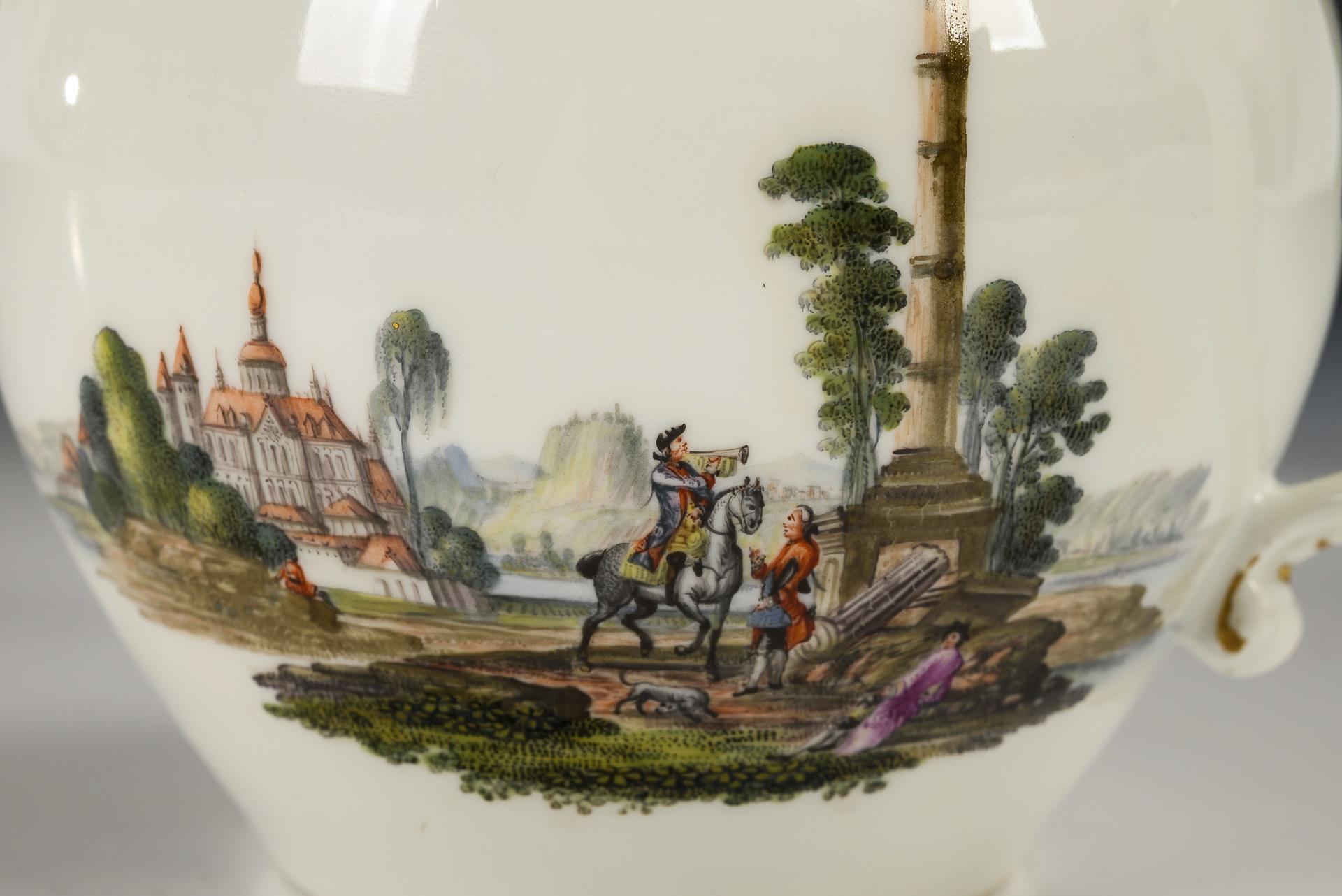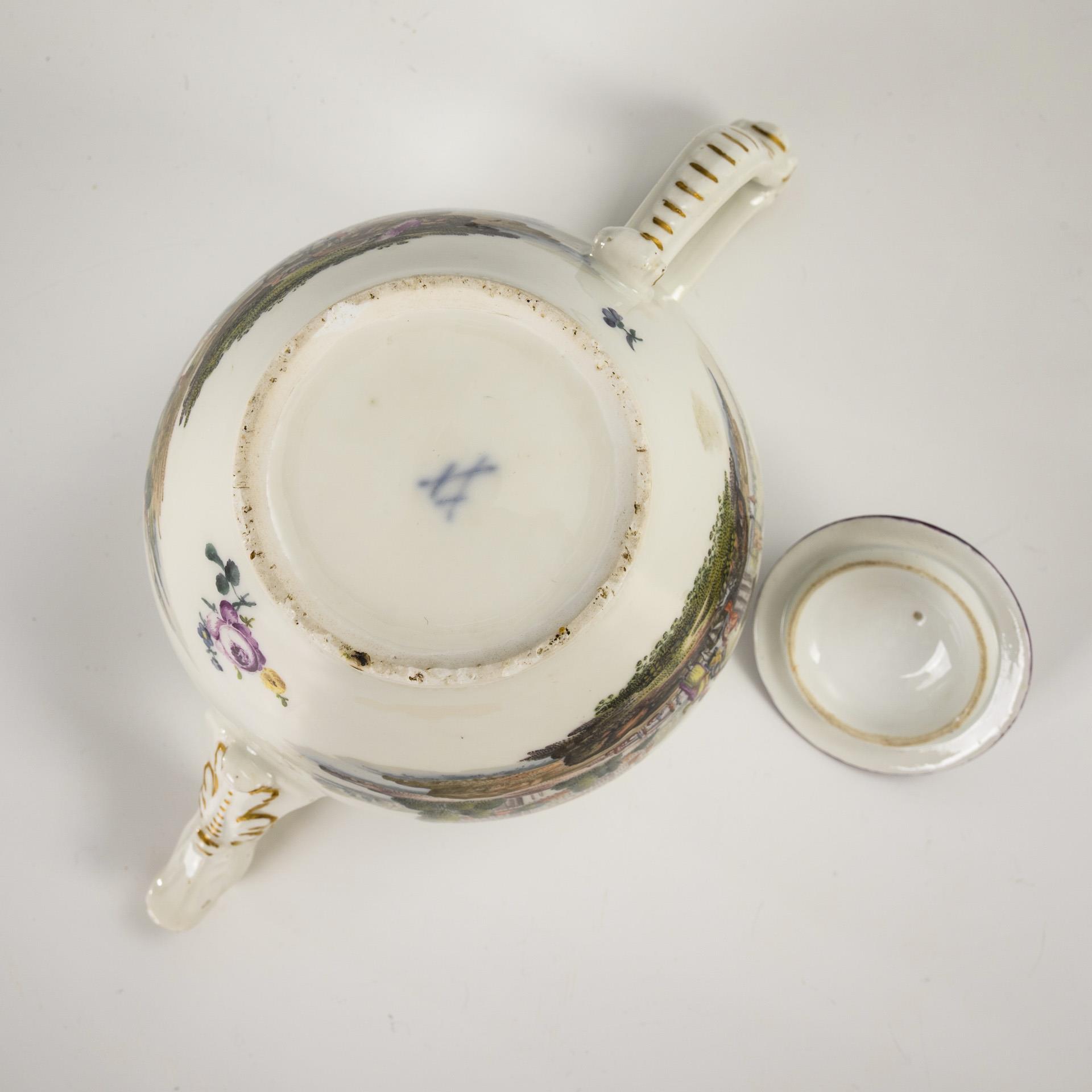 Bellied shape with purple border and flower painting. The wall with high-quality painted landscapes with architecture and a rich staffage of people. Lid restored.