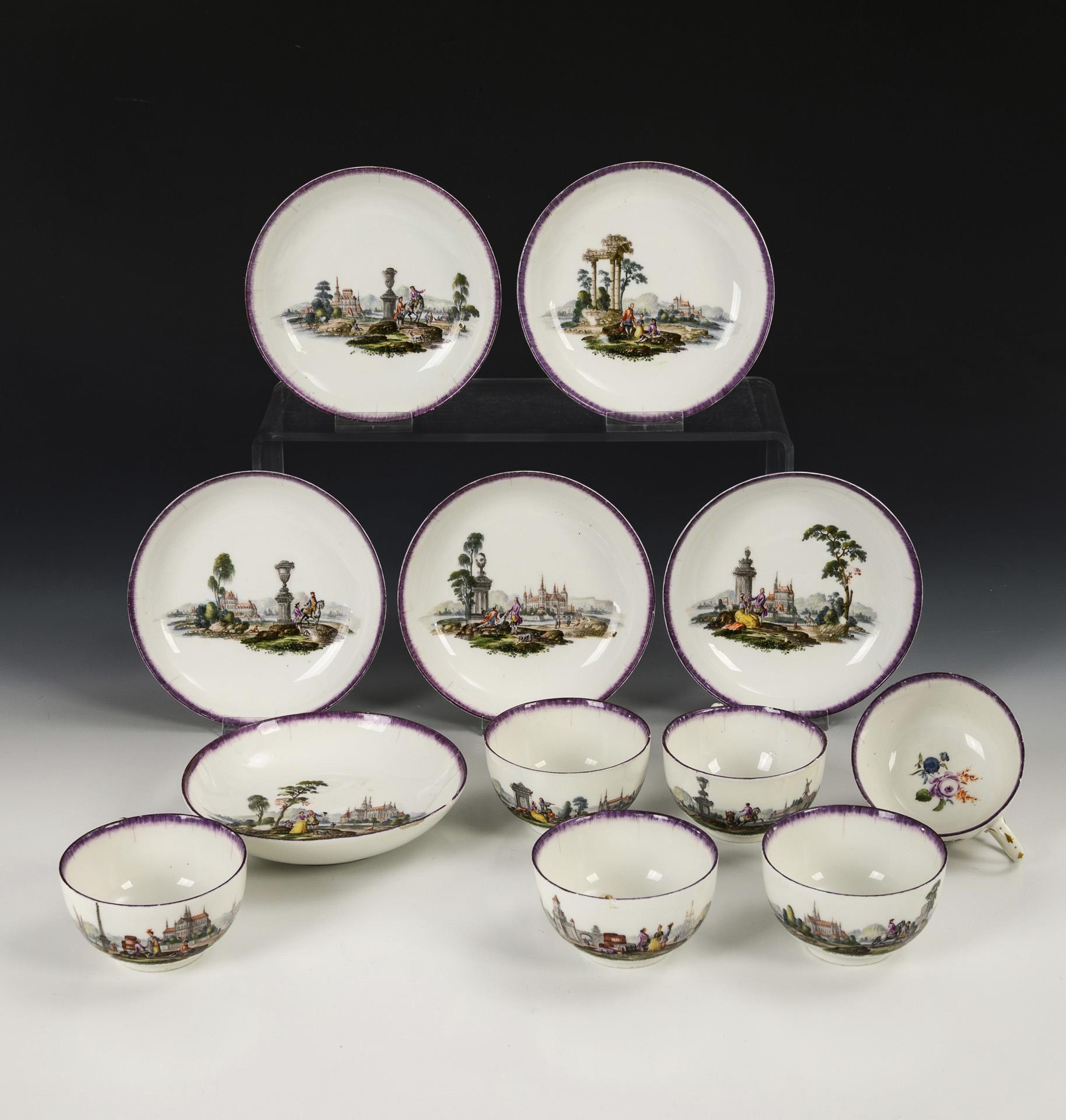 Bellied shape with purple border and flower painting. The walls with high-quality painted landscapes with architecture and rich staffage. 1 saucer with firing crack under the glaze, 1 saucer and 2 cups with edge chips, chip to 1 cup rim.