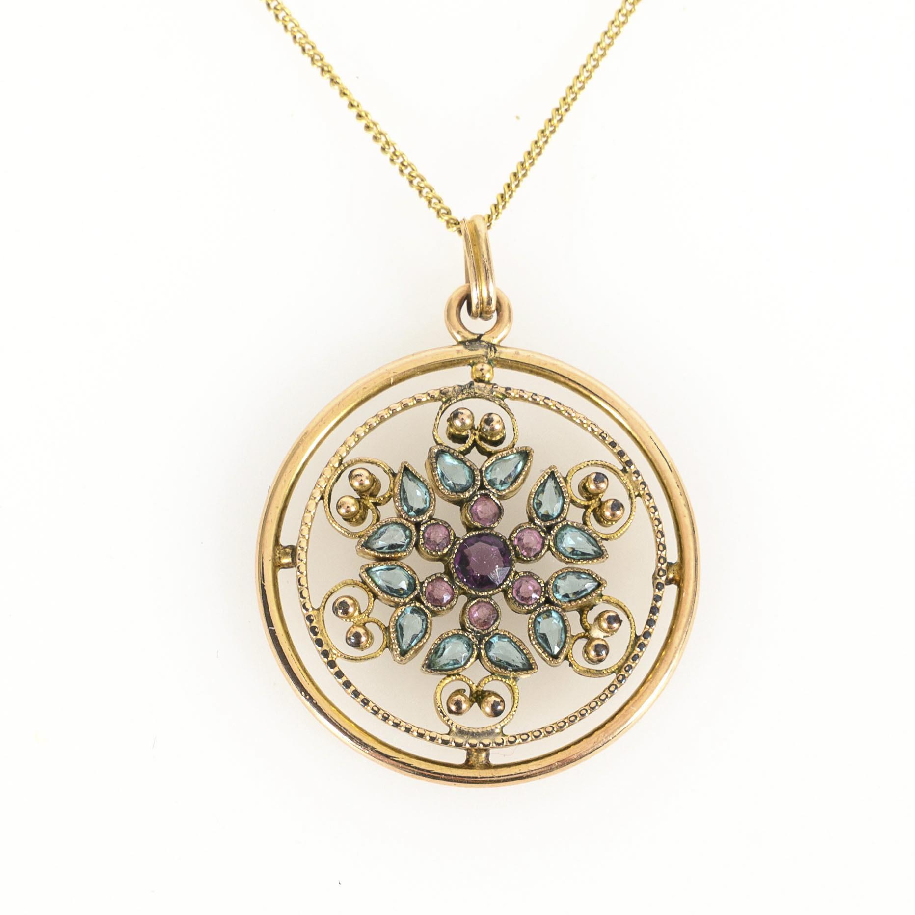 Round Art Nouveau pendant, decorated with a geometric, flower-like pattern with light blue, antique pink and a purple gemstone, on a long chain. The chain has been added more recently.