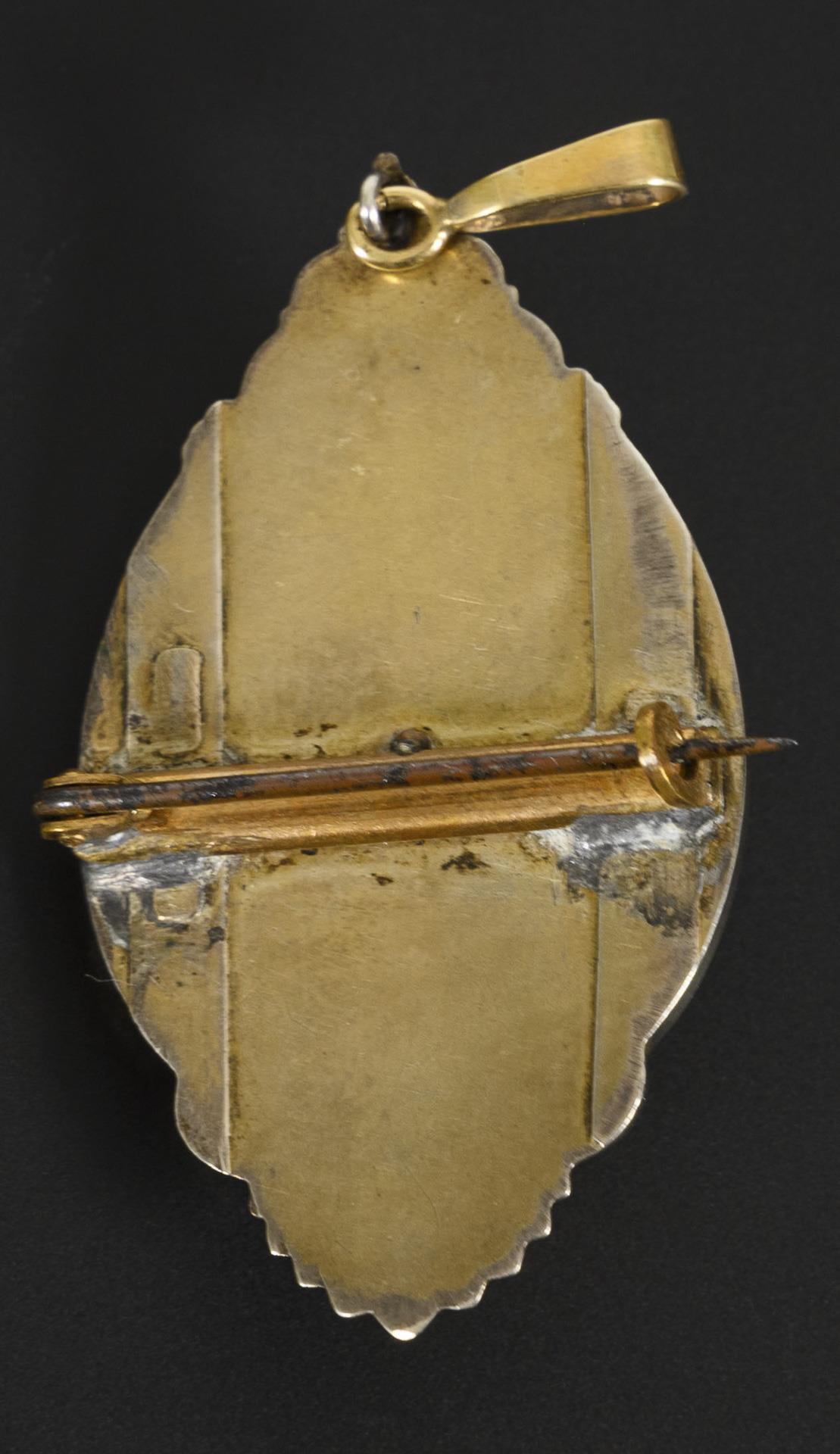 The eyelet hallmarked yellow gold 585, the medallion tested yellow gold 333. Max. approx. 46.88 x 27.70 mm. 10,5 g.