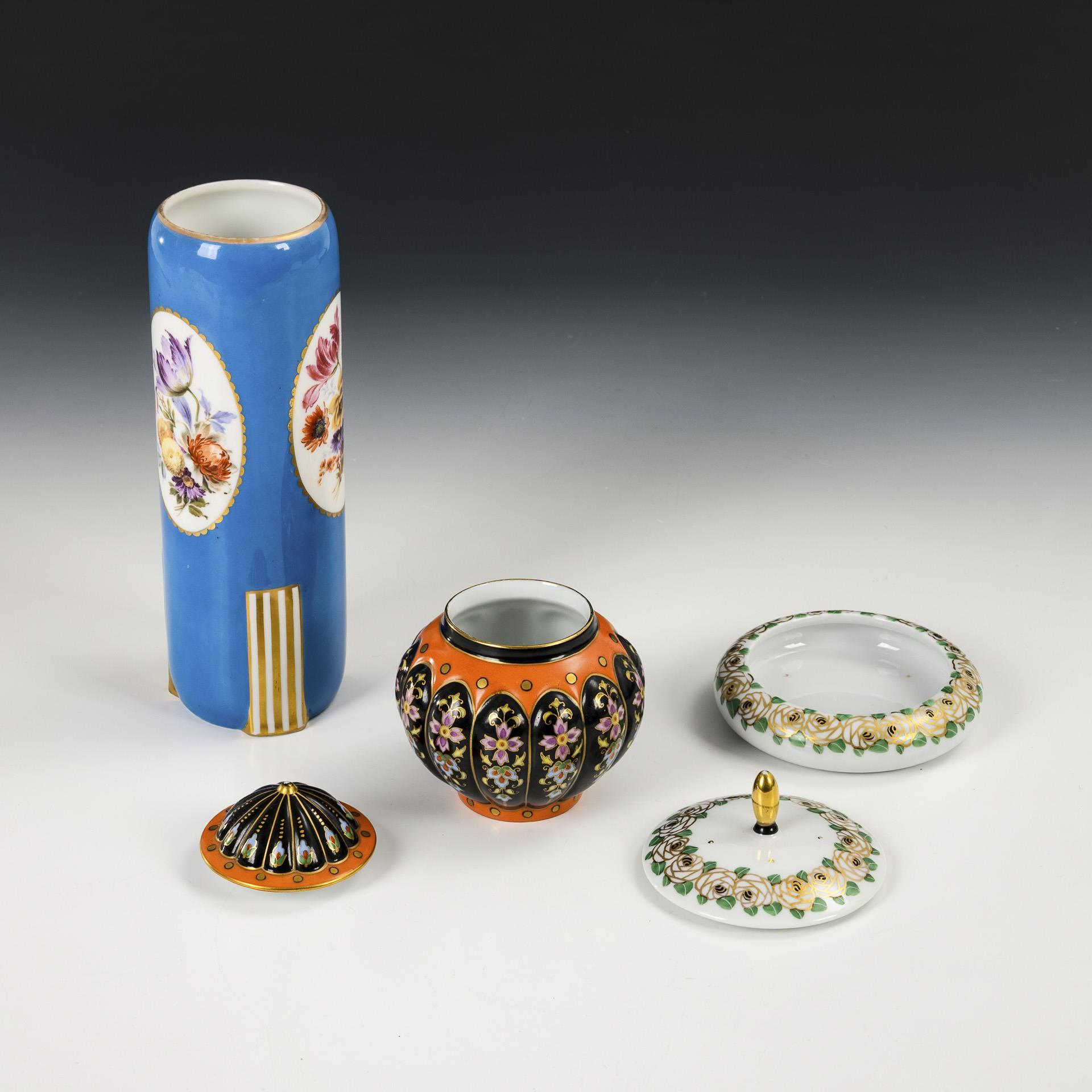 1x pressed, bulging box with stylized rose decoration in gold, black and green (h 6 cm). / 1x straight godroned baluster box with orange and black partial ground and stylized, polychrome flower painting (H 10 cm). / 1x cylinder vase with light blue ground and floral decoration (H 20 cm).