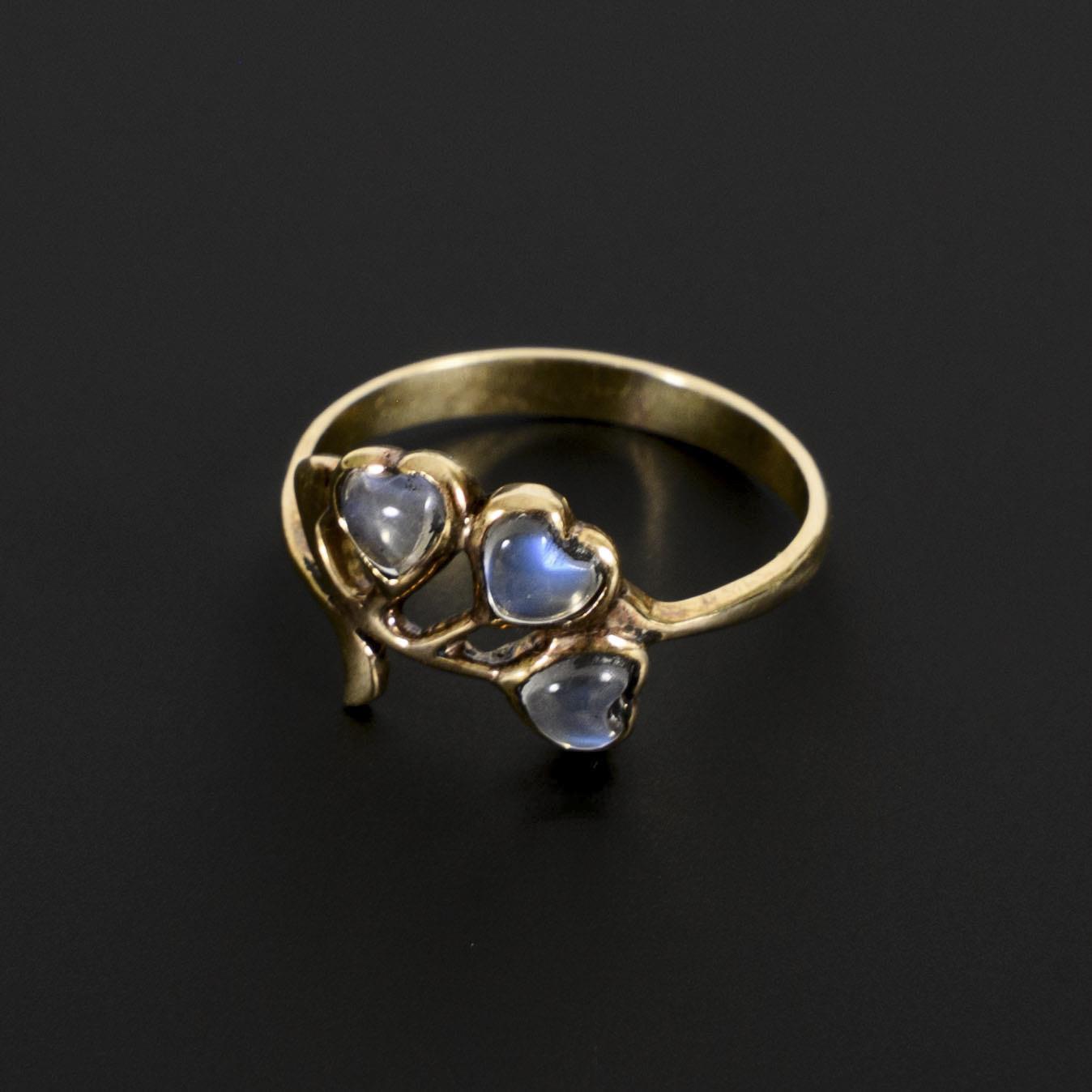 Delicate ring in the shape of a flower branch. The blossoms consisting of 3 bezel-set, heart-shaped moonstones.