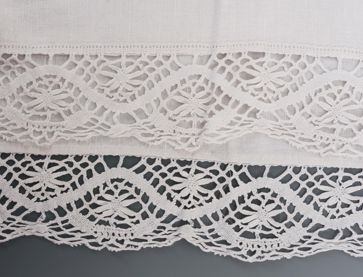 Große Tischdecke mit Klöppelspitze.