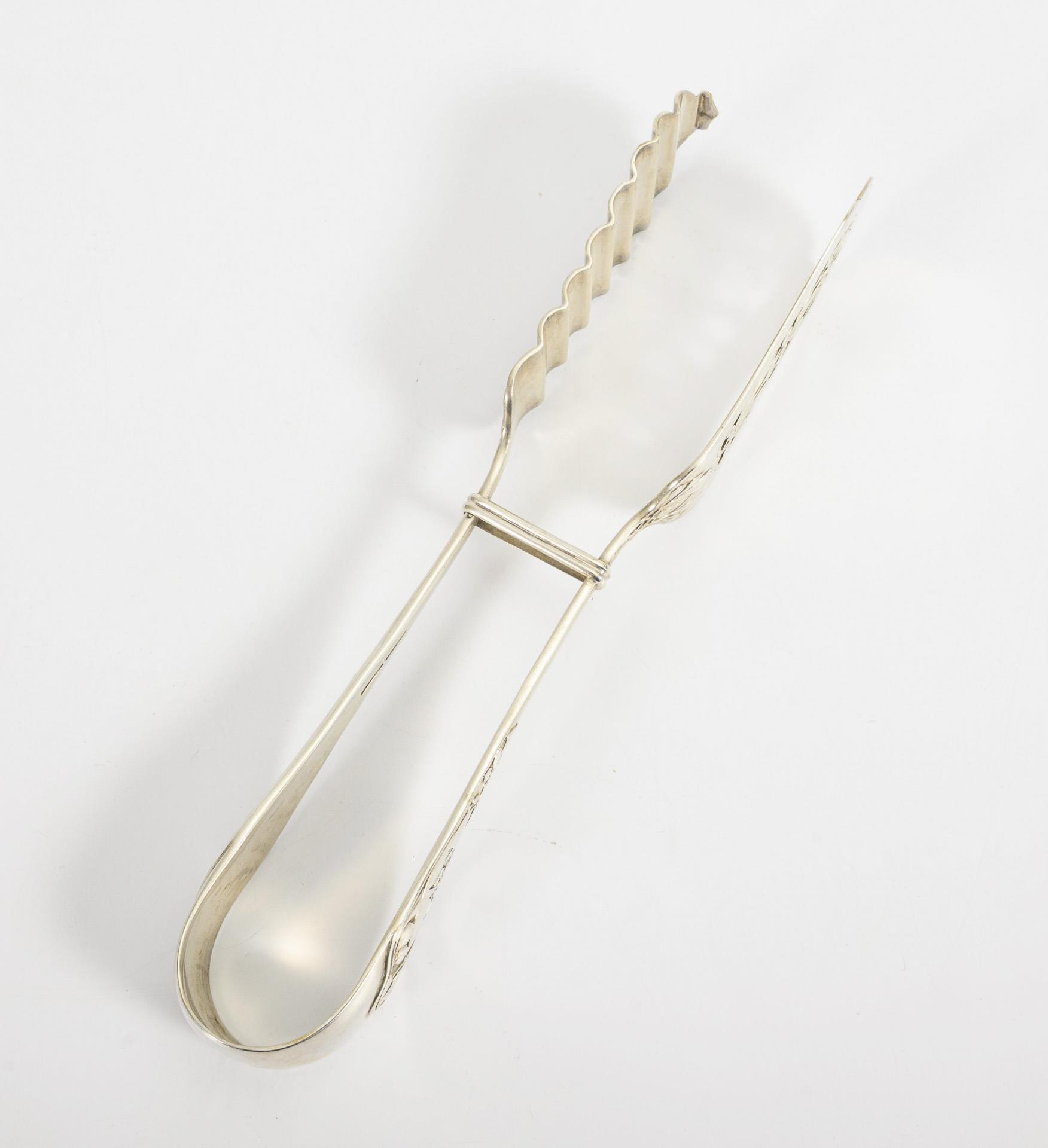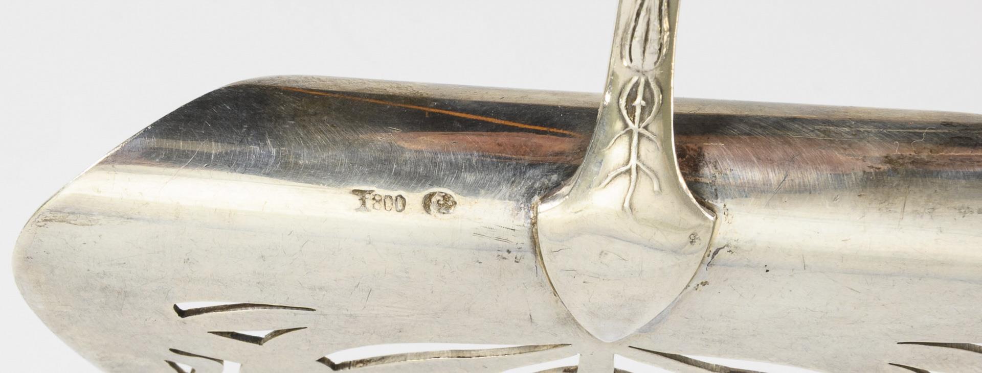 Asparagus server hallmarked with Koch & Bergfeld/800/crescent/crown. Asparagus tongs hallmarked with Wilkens & Söhne/800/crescent/crown. Both with floral reliefs and floral engravings, partly pierced, each monogrammed "HST". Minimal signs of age and use.