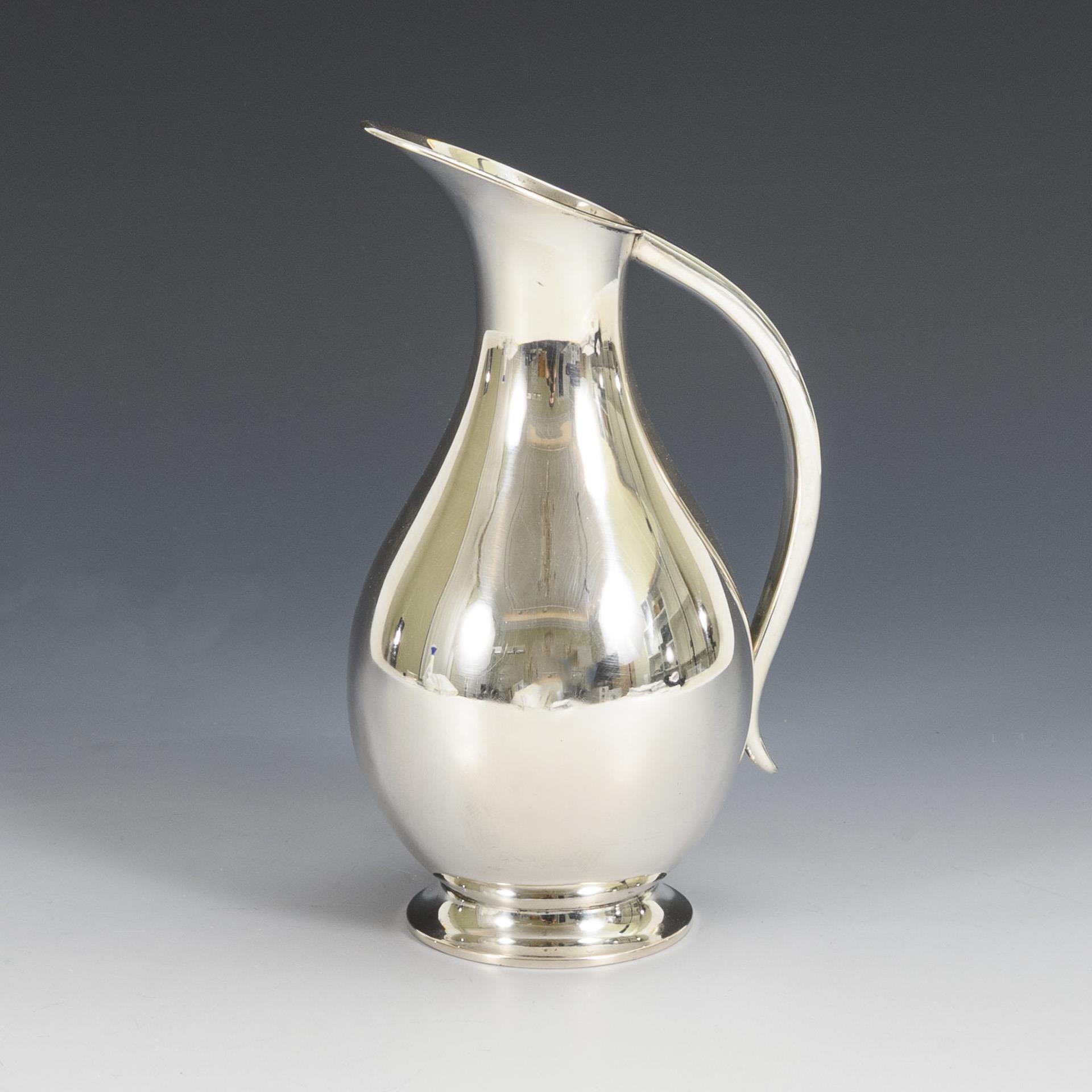 Smooth teardrop shape with slanted spout and scalloped band handle, on round foot.
