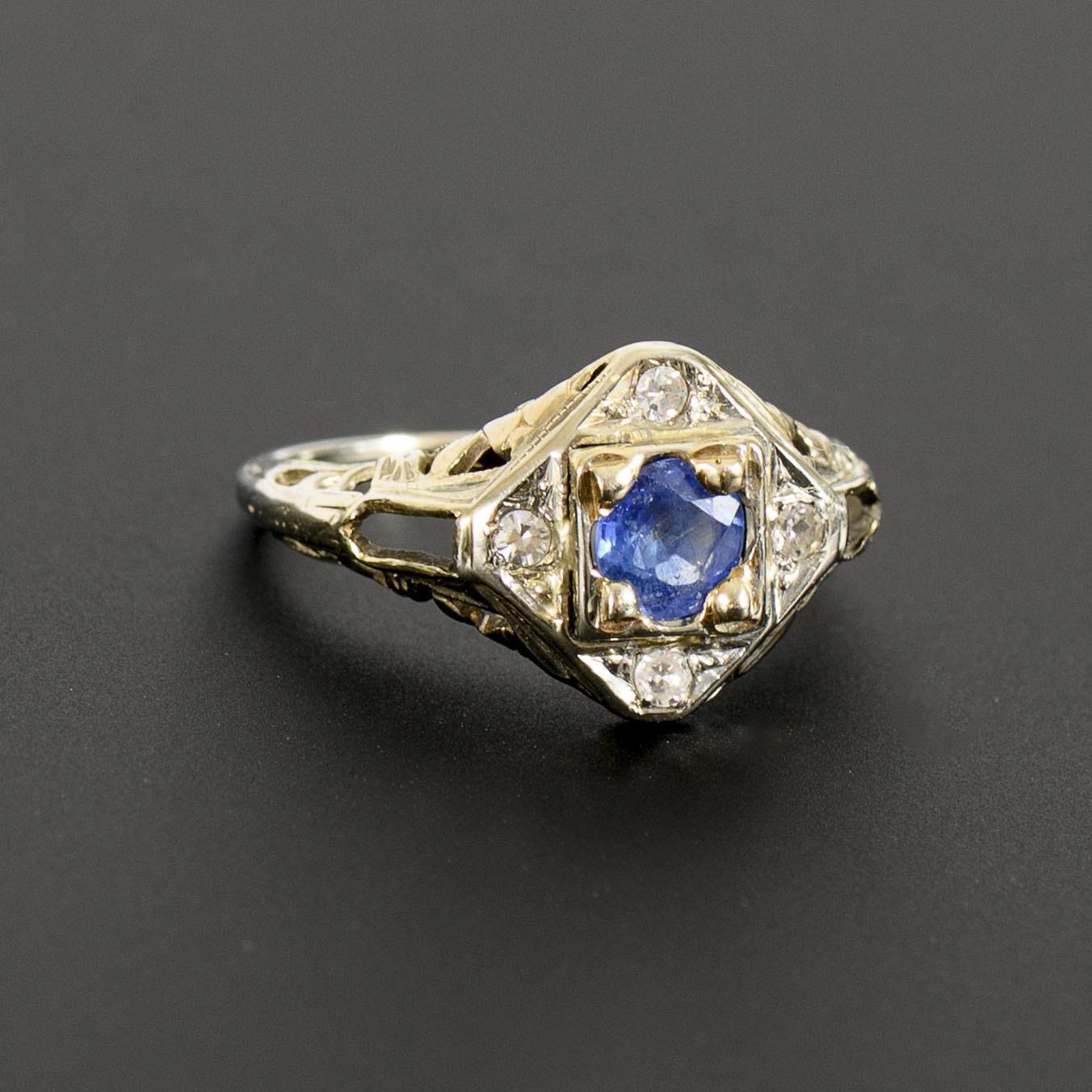 Art Nouveau ring with blue colored stone, probably sapphire, and diamonds.