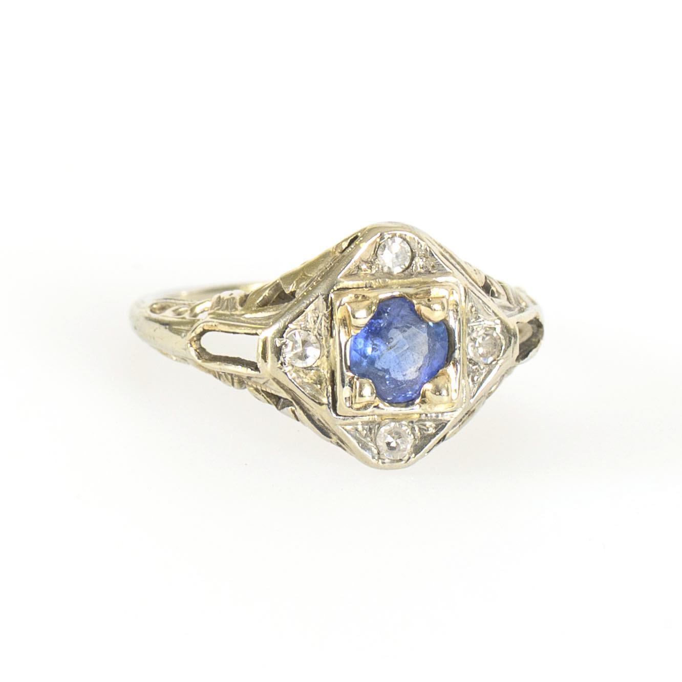 Ring with a blue colored stone, probably a light sapphire, surrounded by 4 small diamonds set into the ring head. Ring head and shoulders raised and open-worked in a pattern of latticework and flowers.