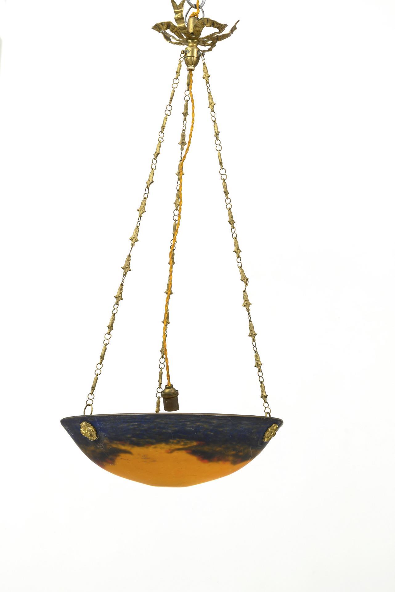 Bronze, satin-finished clear glass with orange, blue and red powder fusions, electrification with 1 bayonet socket. H 75 cm, Ø 34 cm. 3.2 kg.
