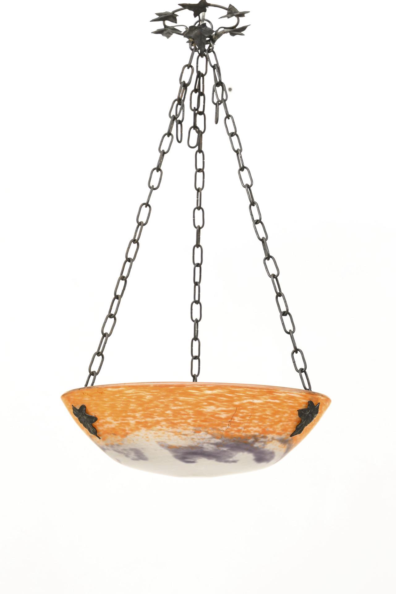 Bowl lamp with vine leaf holders for the 3 chains to the canopy in the form of a leaf wreath. Bowl center ground, few traces of age/use, wiring missing.