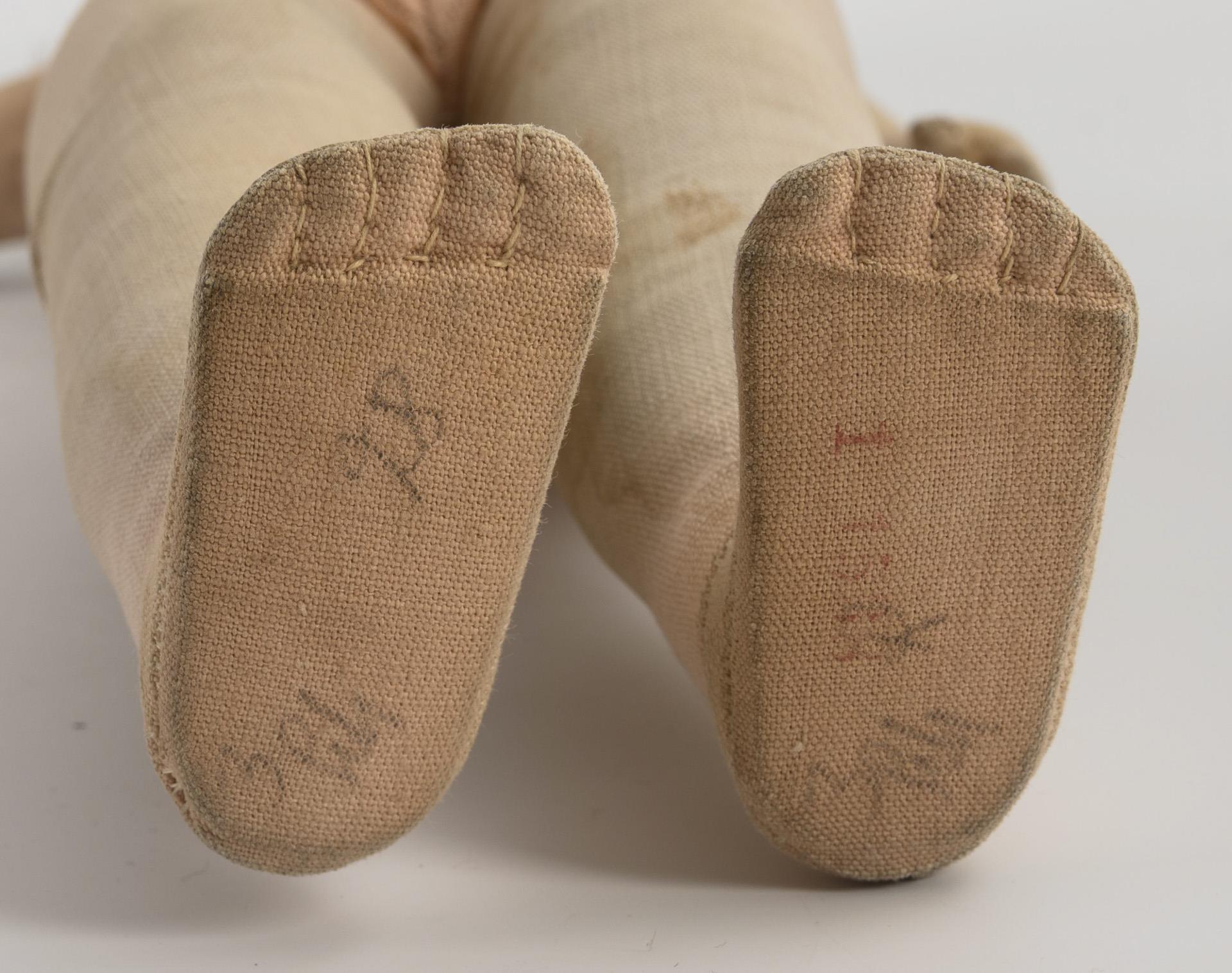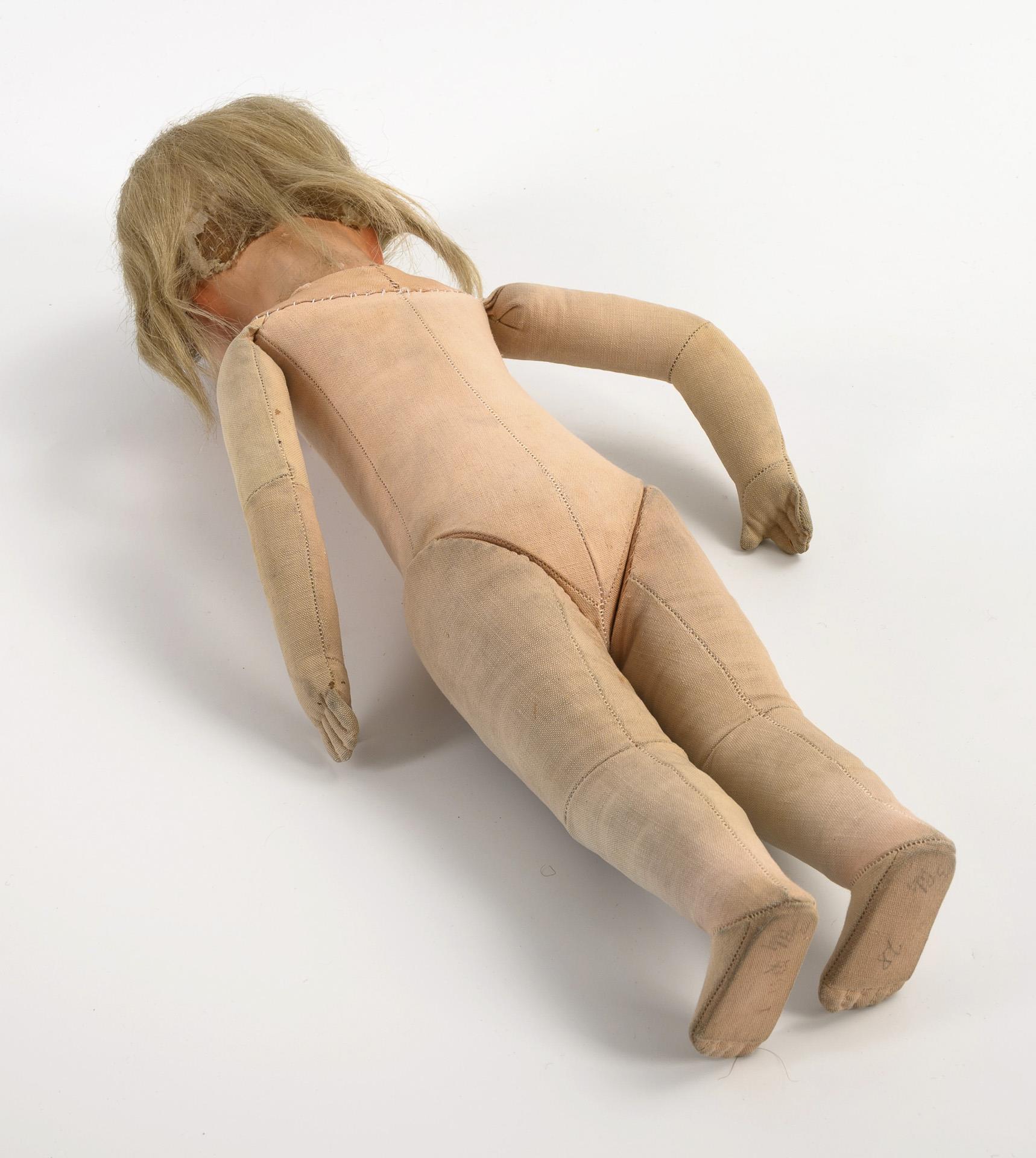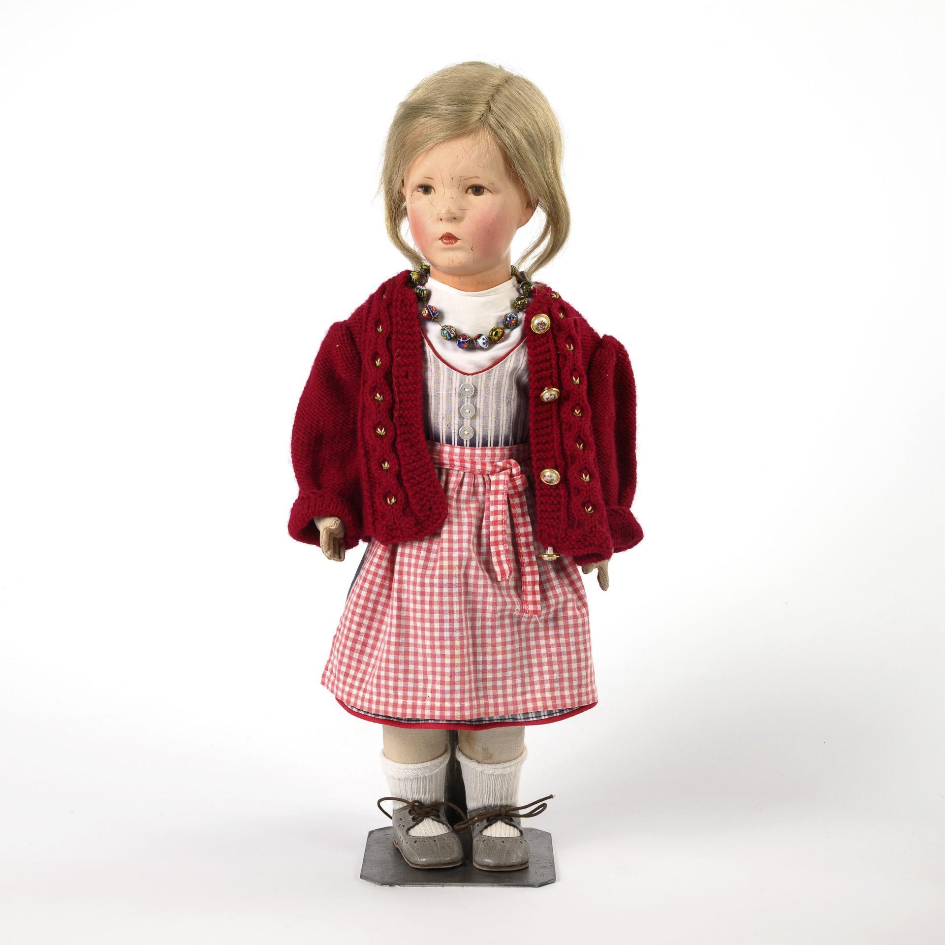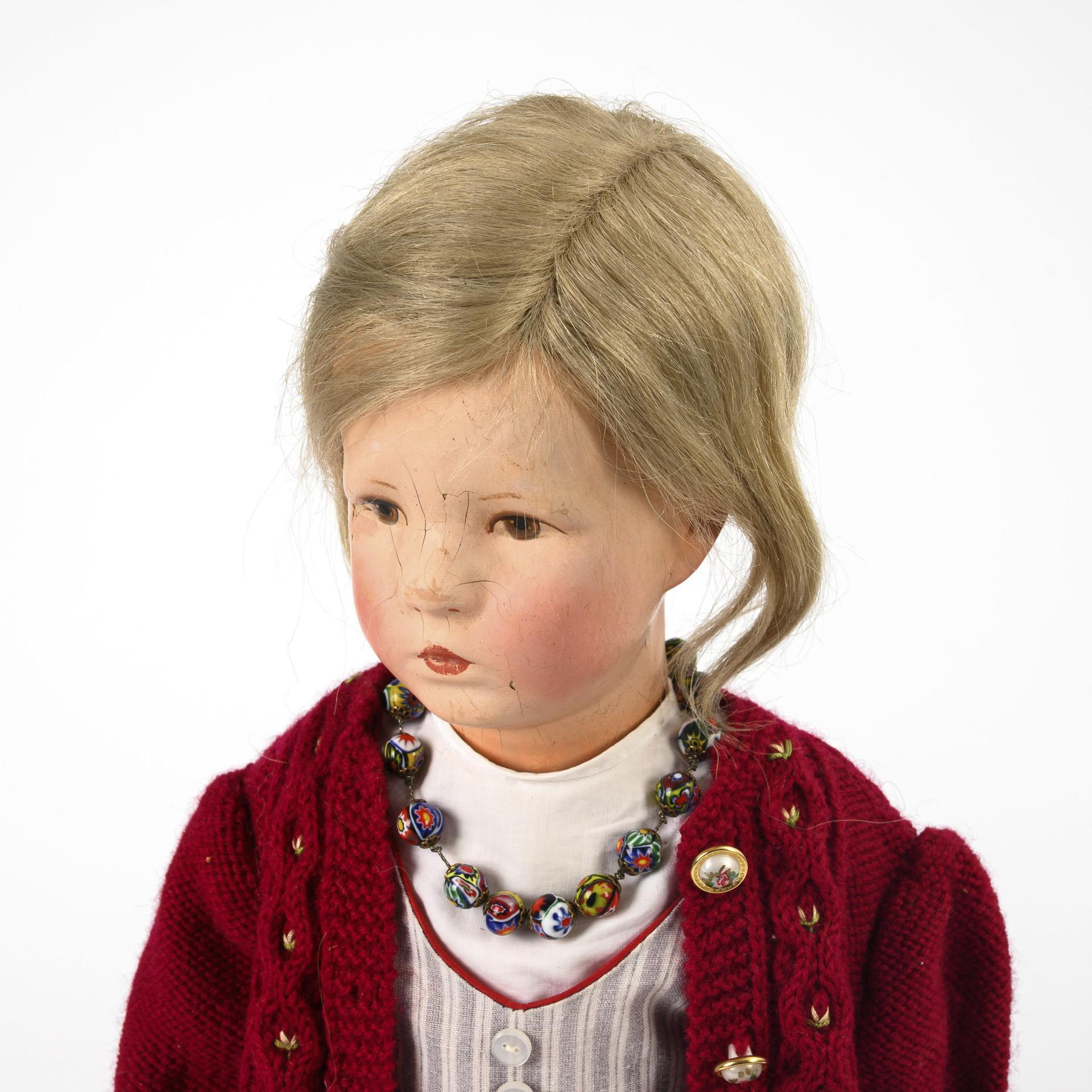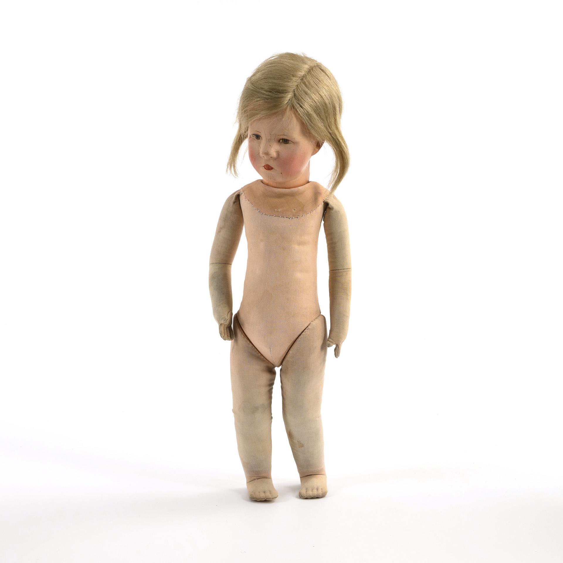 Crank head, blond human hair wig, painted brown eyes. Fabric body with elbow and knee seams. Striped dress, checkered apron, red cardigan, grey leather shoes. Face cracked, with color defects and retouching. Body stained.