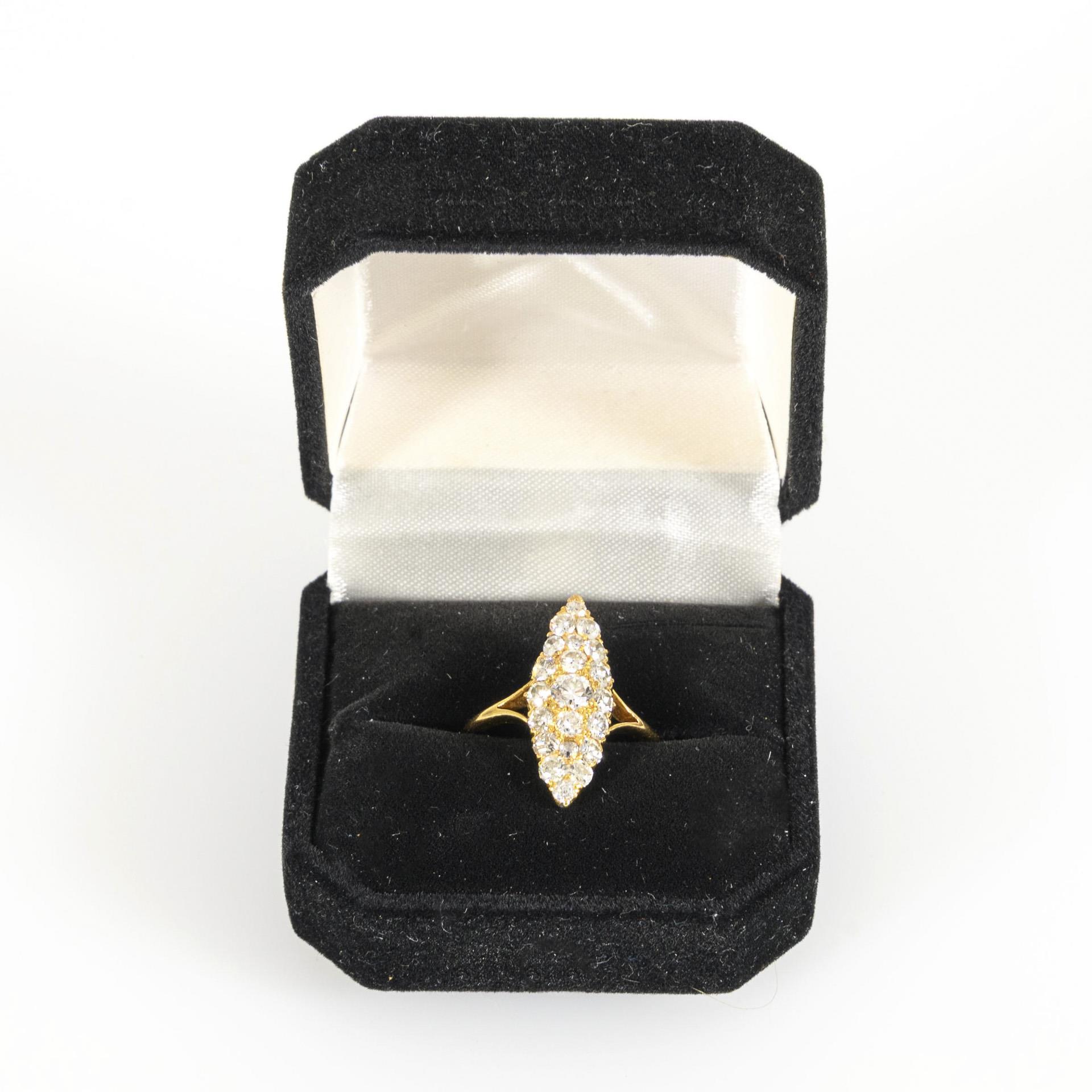 Navette or "boat" ring with old-cut diamonds on a delicate rail, probably around 1890-1910.