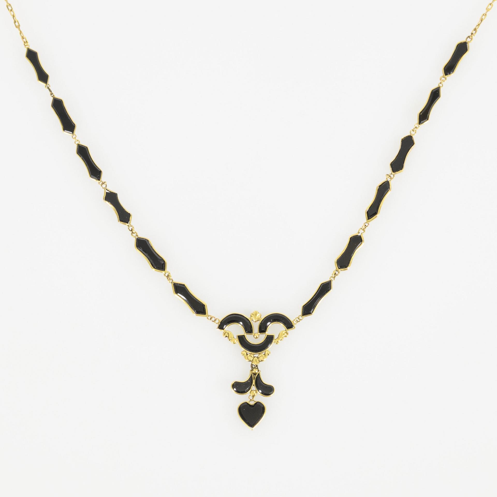 Necklace with onyx inlays of various shapes, the suspensions double movable. Antique pin lock. Minimal chips to the edges of some of the onyx inlays, traces of repair to the suspensions on the back, the lock slightly bent, holds securely.