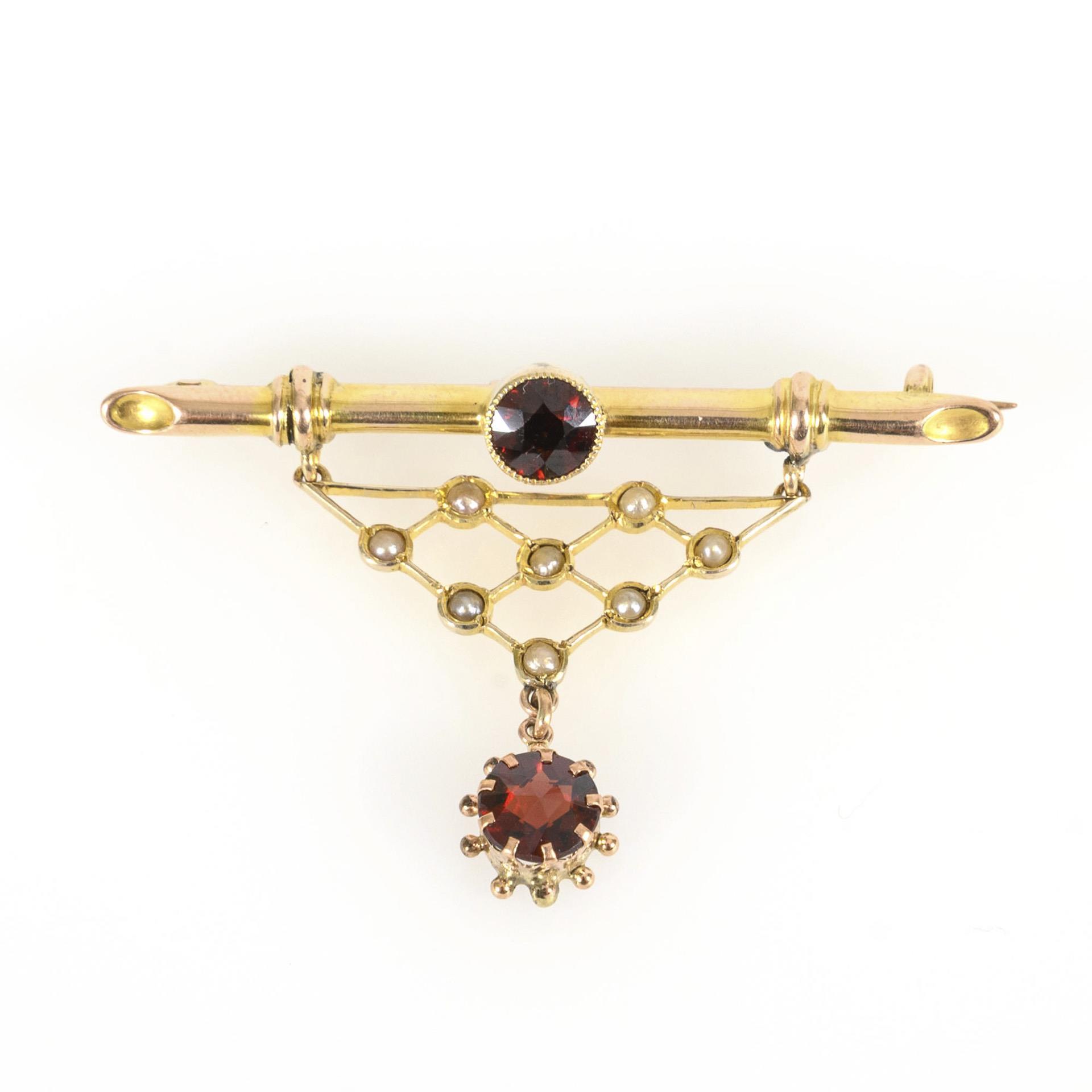 Art Nouveau brooch with hallmark from 1909. Bar brooch with triangular, grid-like suspension, set with 8 small seed pearls. In the brooch and as a suspension a round garnet stone, one round-faceted, the other rose-cut. The back with a simple hook fastener and a small, rigid eyelet. Traces of repair to the suspension of the pendants and the brooch on the back.