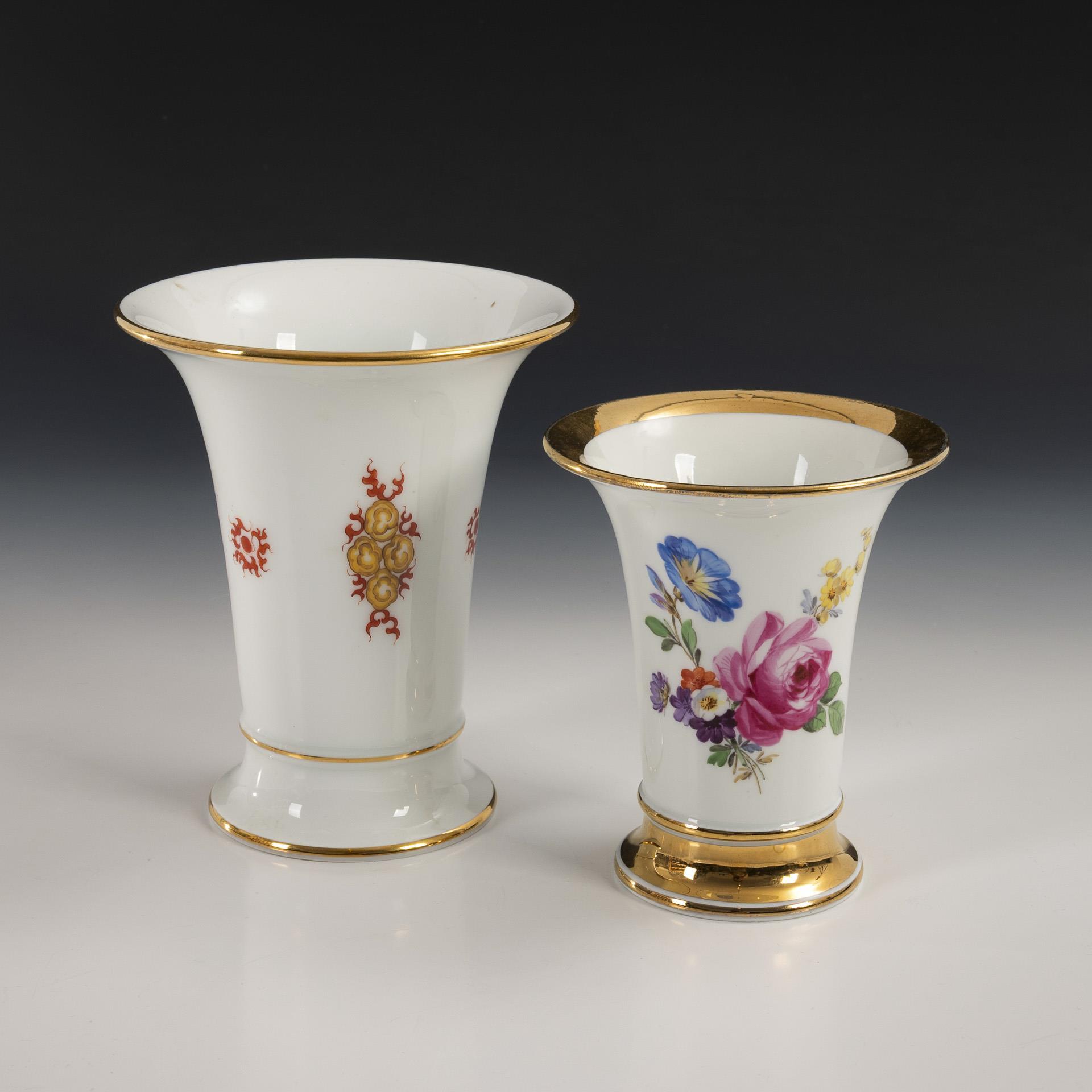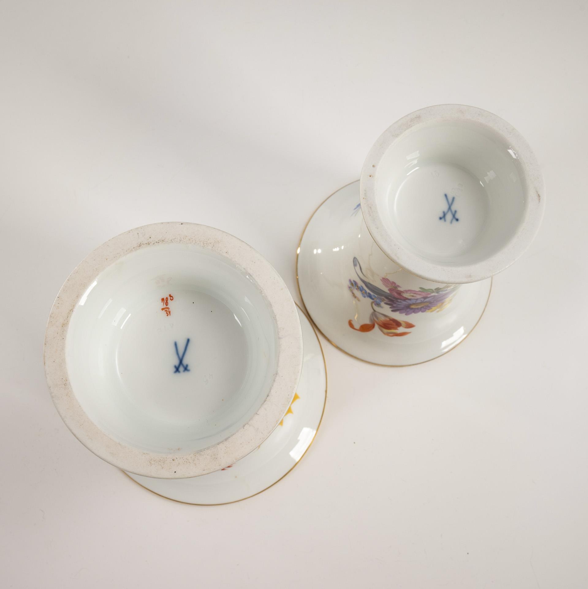 Polychrome painted, decorated in gold. H 16.5 and 13.5 cm.