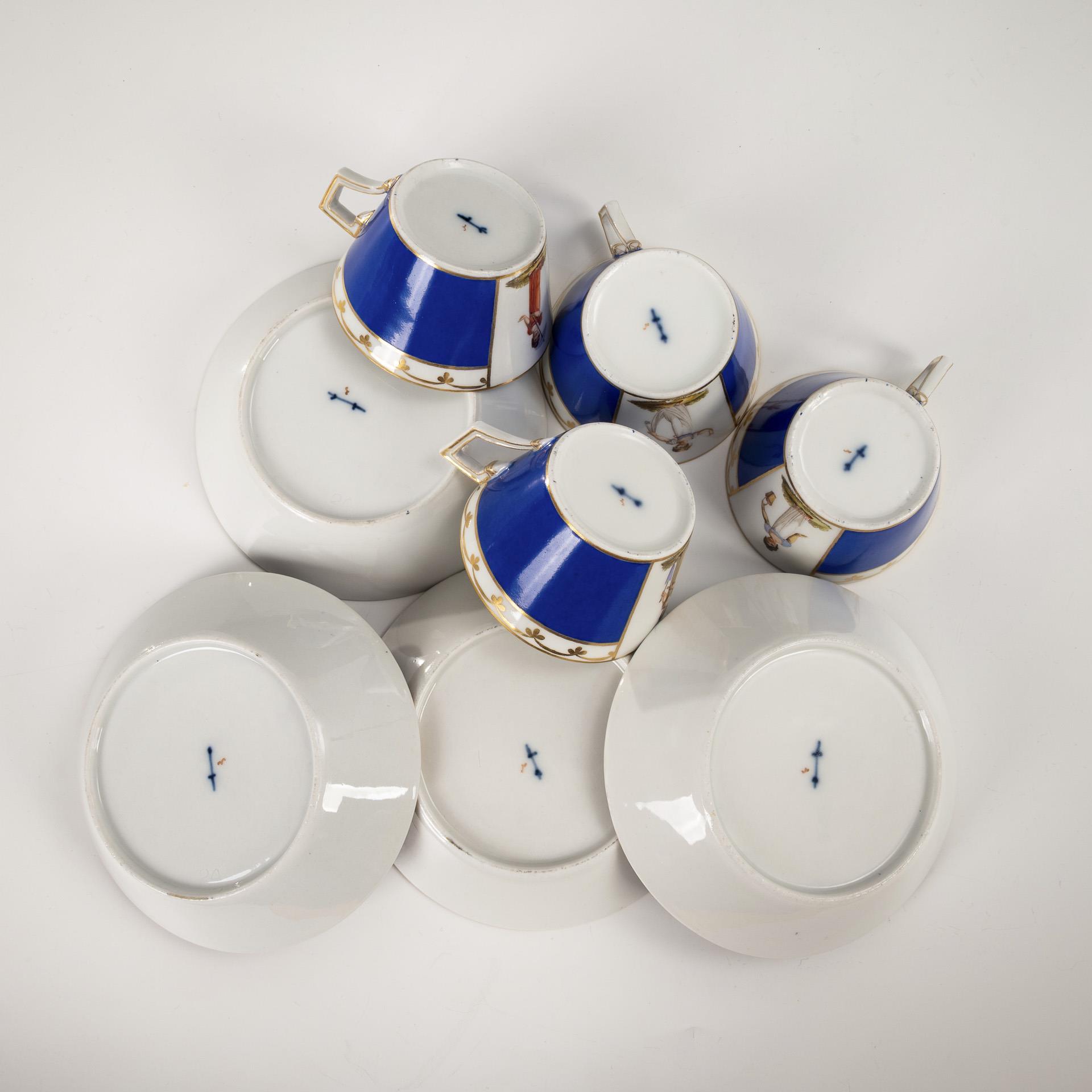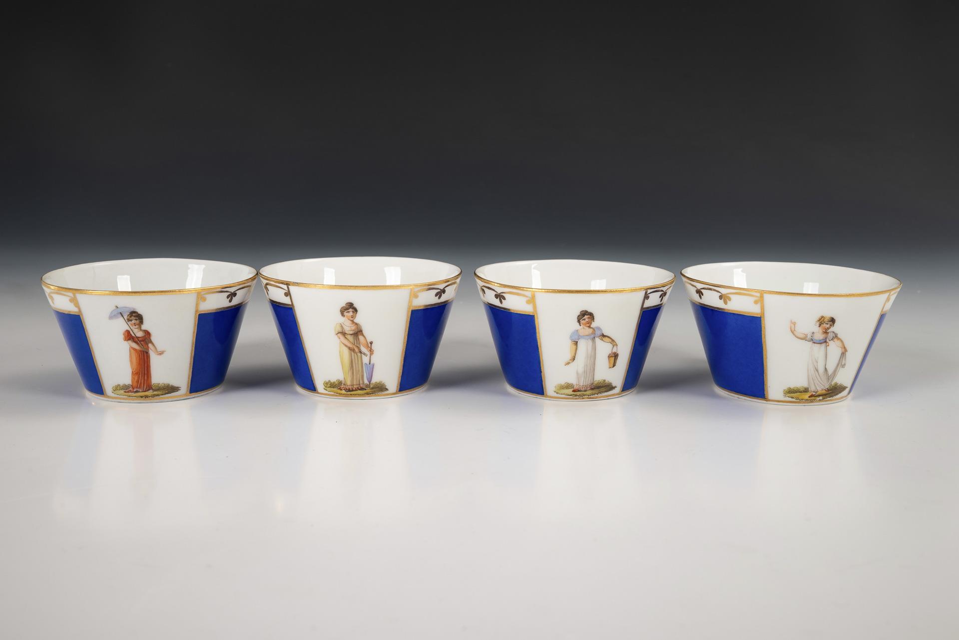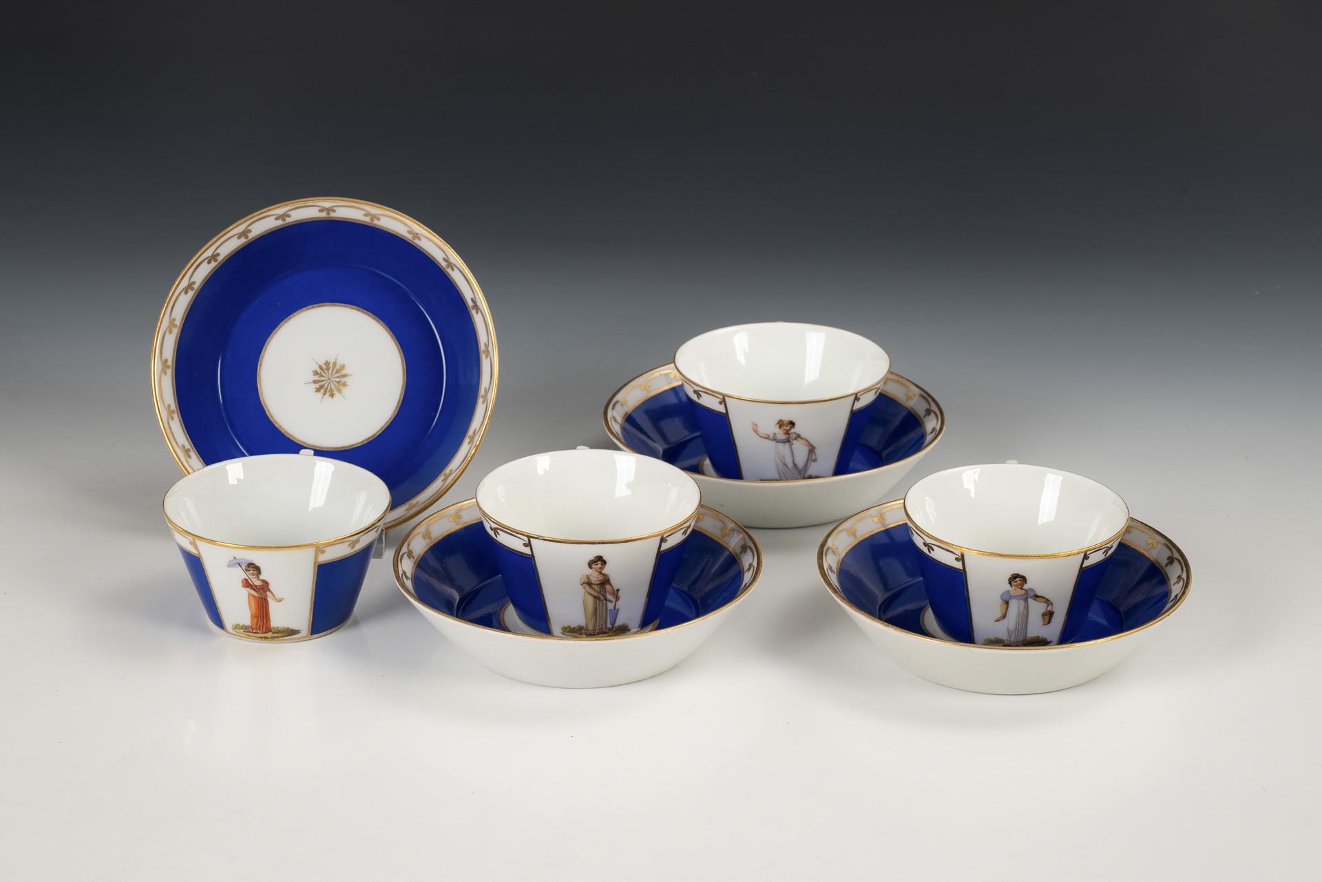 Model "Conical". Gold border and royal blue ground, on the front a gold-framed rectangular cartouche each depicting a lady dressed in the Empire style. 1 handle minimally chipped.