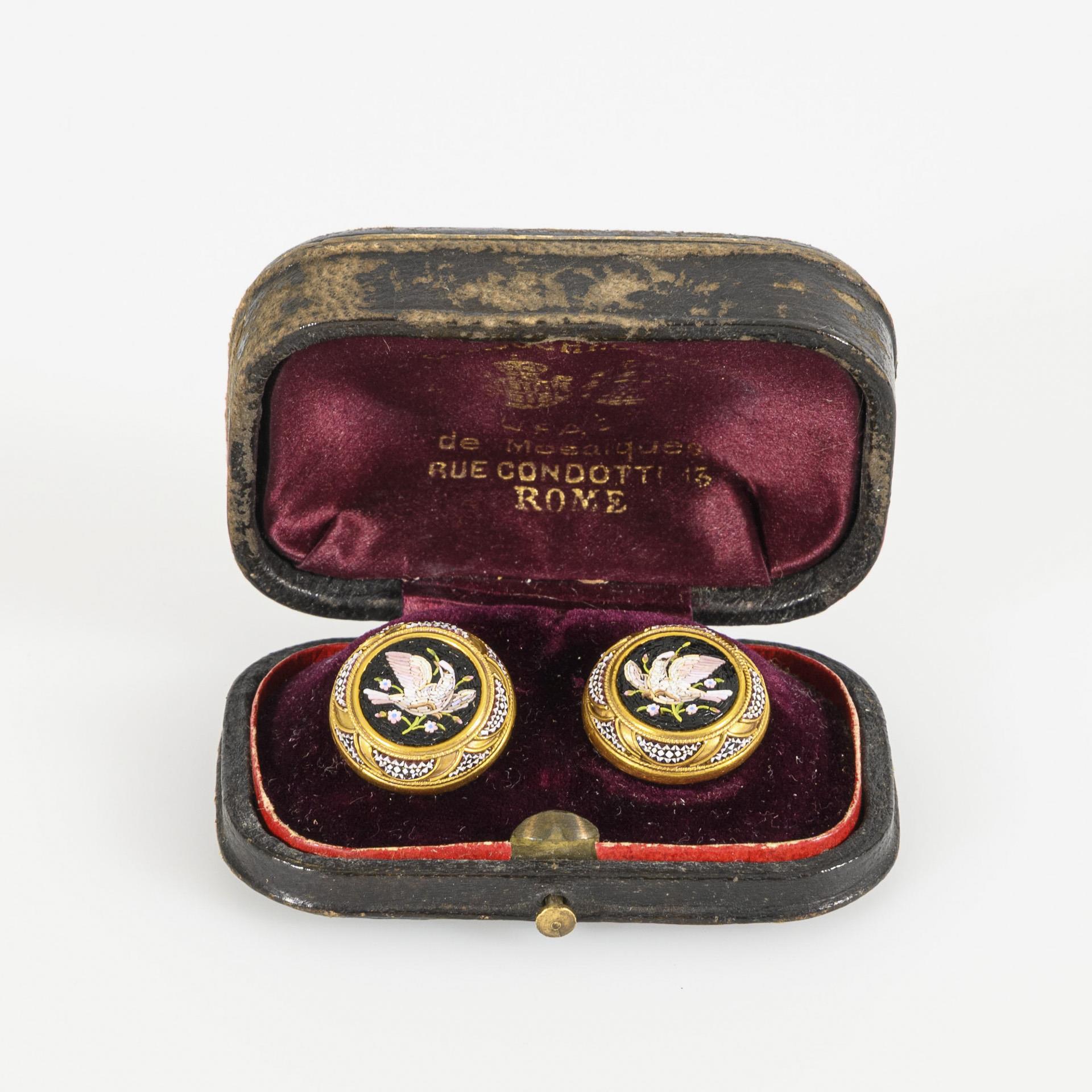 Pair of so-called "Bachelor Buttons", historical type of cufflinks, each with a small micromosaic depicting a dove on a flowering branch.