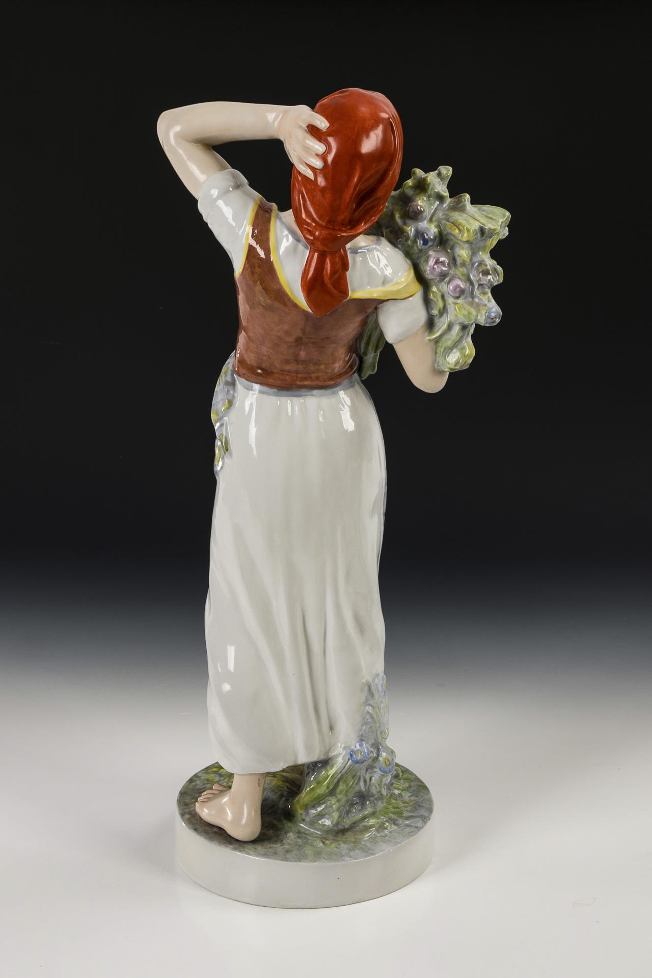 A young peasant woman standing on a round natural base with a bouquet of grain and flowers.