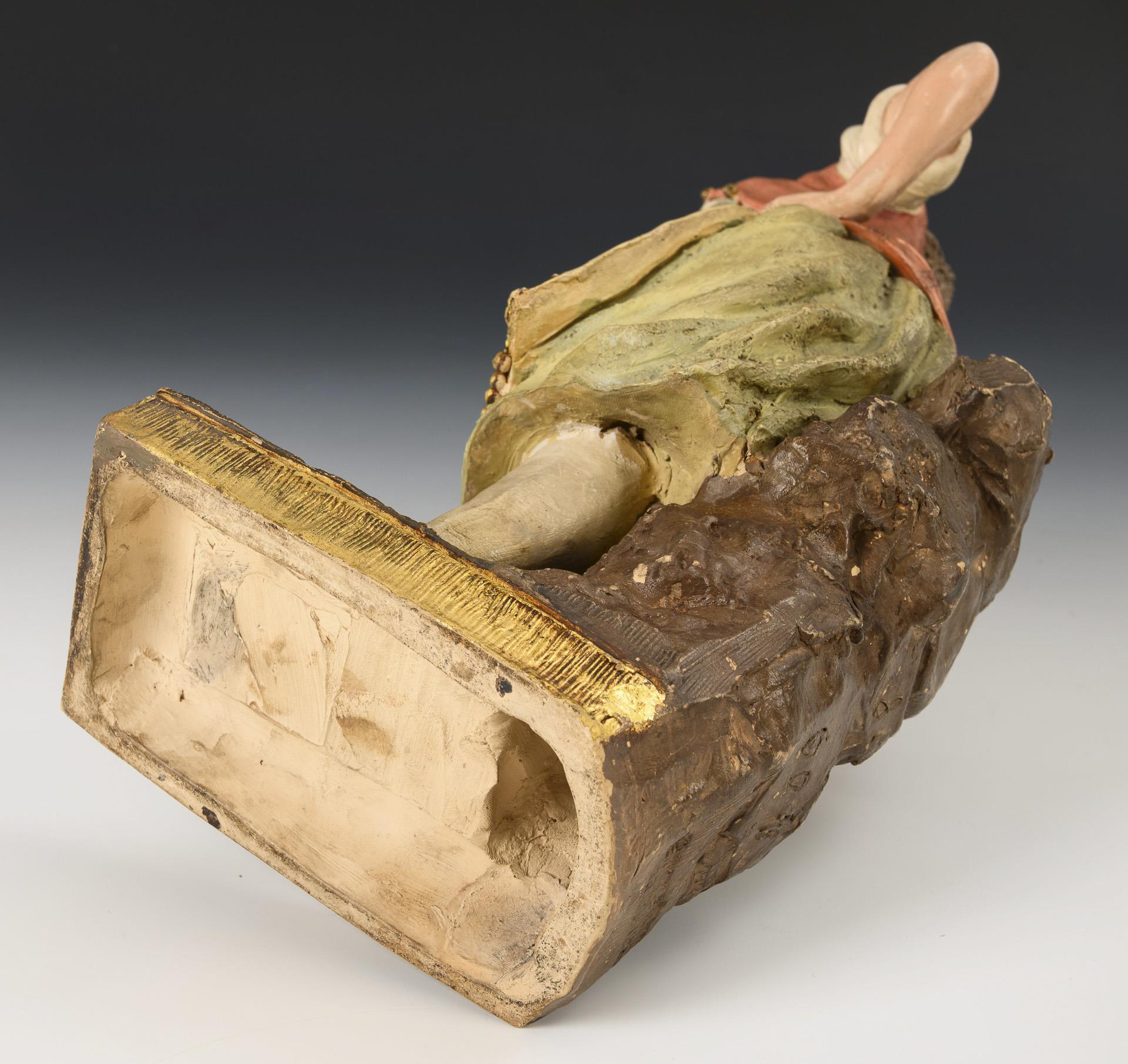 Standing figure of a friendly landlady(?) with apron, on a rectangular base with tree trunk support on the back. 1 finger broken off.